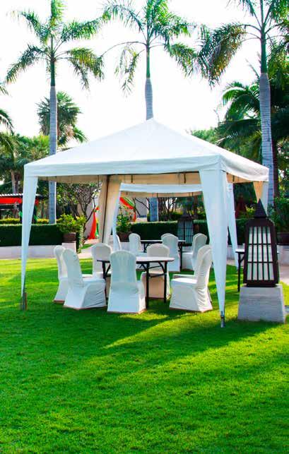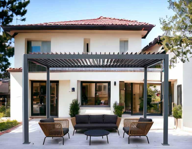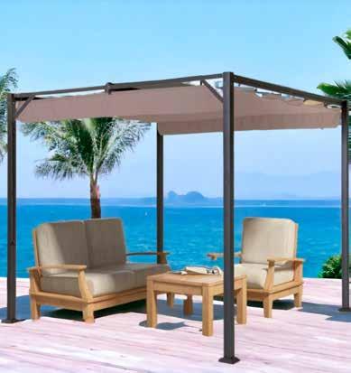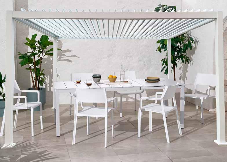 BIOCLIMÁTICA NASAU 3X4 M. Altura 2,40 m. Estructura de aluminio acabado blanco. Patas 10x10 cm. Techo de acero galvanizado.