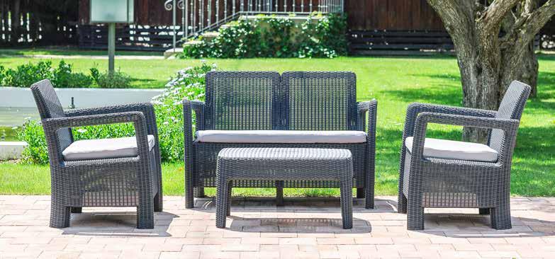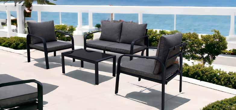 Compuesto por: mesa, un sofá y dos sillones de jardín con cojines. Sillón. Med.: 71x69x79 cm. Sofá. Med.: 120x69x79 cm. Mesa. Med.: 77x55x40 cm.