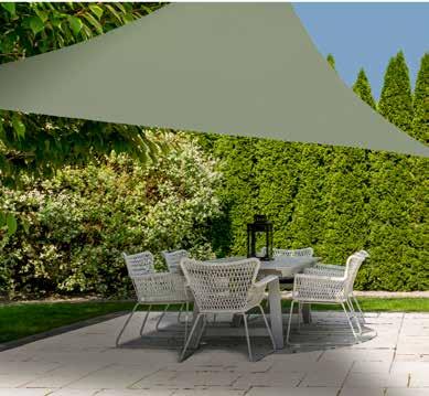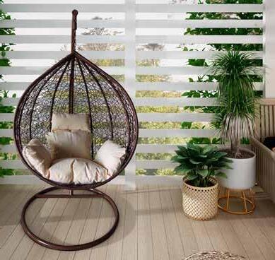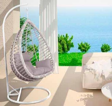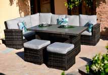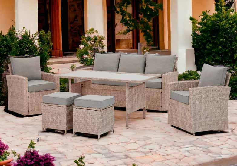 Ratán sintético acabado gris o marrón degradado. Cojines poliéster acabado topo (180g/m2).