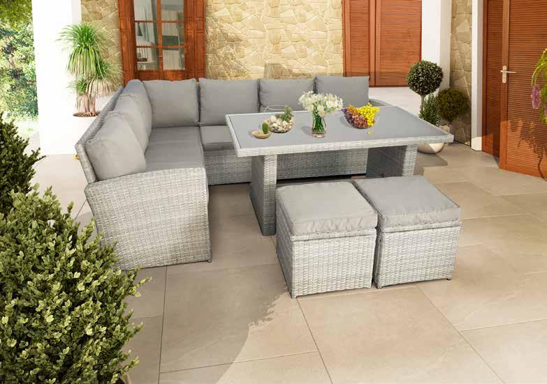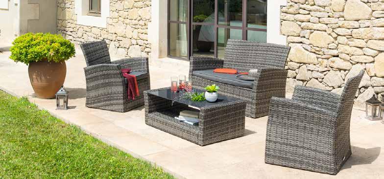 Ratán sintético acabado gris degradado. Cojines poliéster acabado gris (180g/m²).