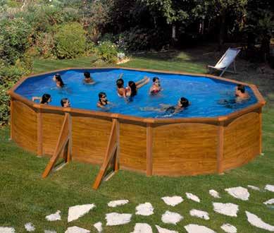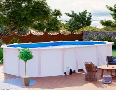 Acero blanco. Incluye depuradora con filtro de arena y escalera de seguridad 2x3 peldaños. Med.: 610x375x120 cm.
