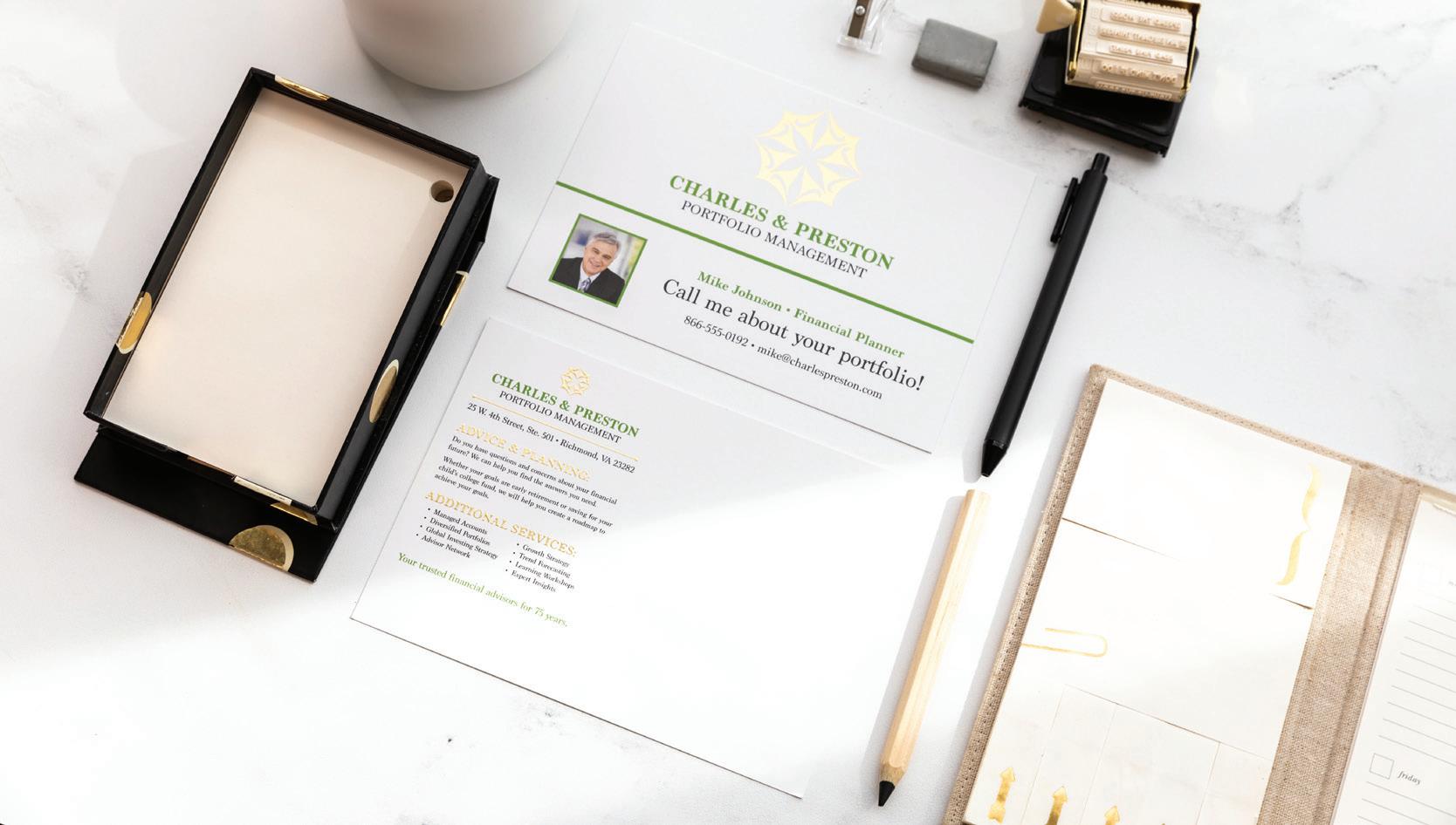Pearlized business cards offer an iridescent finish that gives full color artwork a unique glimmer.