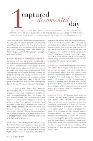 FINDING YOUR PHOTOGRAPHER Tempting as it may be to enlist the talents of an acquaintance who dabbles in photography — don’t. Experienced photographers have the experience, equipment and know-how to make your photographs sensational. They understand the different moods created by proper lighting and posing, and use reliable techniques and equipment to create quality images. Not to be overlooked is the fact that your photographer has but one opportunity to get it right. There are no second chances. STYLE Just a few years ago wedding photography styles could be conveniently grouped into two categories: traditional and photojournalistic. Not so, today. As you delve into the task of finding your lens master, you’ll quickly discover a plethora of new styles. From vibrant enhanced color process to the milky, washed-out tones of the vintage process, or even the retro Fuji Instant prints, photographers are doing more with specialty filters, lenses and post production software than ever before. Find a photographer whose portfolio showcases the style you’re drawn to. LIGHTING Like photographic styles, you’ll find that most photographers have specific strengths and preferences when it comes to lighting. Some are masters with natural light, others excel in delivering spectacular 42