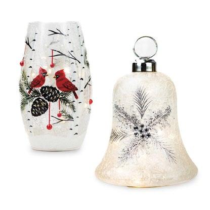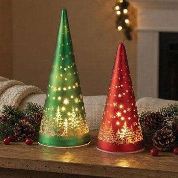 Illuminate your home with our enchanting glass trees! These 10" and 8" green and red accents feature lights and a handy timer, bringing effortless, sparkling holiday magic to your festive mantel or tabletop display.