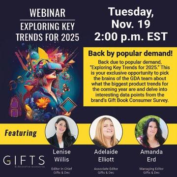 SHOWING OWNERSHIP, MANAGEMENT AND CIRCULATION OF Gifts and Decorative Accessories publication number 432-050, filed October 1, 2024, Published Monthly except for combined issue March/ April, 11 issues per year, $68.97 annually at 7025 Albert Pick Rd Ste 200, Greensboro, NC 27409-9519. The General Business offices of the Publishers are at 7025 Albert Pick Rd Ste 200, Greensboro, NC 274099519.