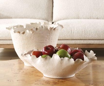 And from REVELATION, the Raised Consciousness Bowl, in two sizes, features the luster of a smooth metal bowl highlighted by its light antique brass finish, which creates the perfect counterpoint to a textured pedestal carved from beige unfilled travertine.