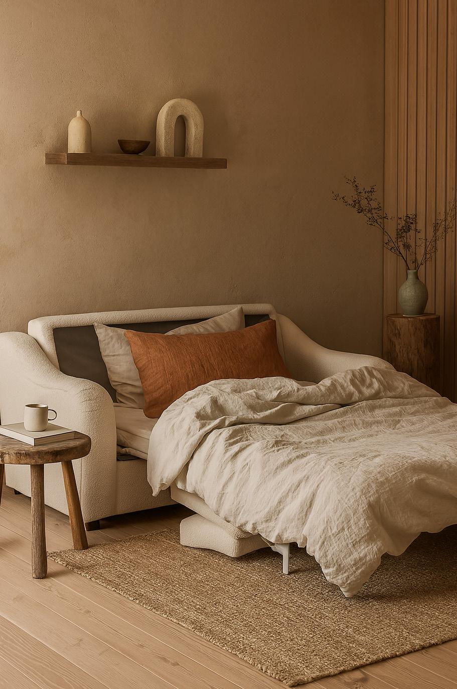 By day, a composed sofa with calm, sculptural lines. By night, it unfolds seamlessly into a generous European double bed, carrying the same quiet elegance into rest.