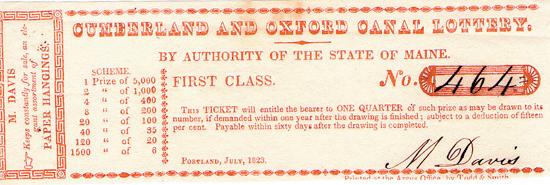 was up to its 14th class in 1827, and it continued until its 23rd class in 1829 when at last the necessary sum was raised. In total, over $100,000 was subscribed for by this lottery, with the remaining funds achieved by supplementary Maine State lotteries until 1831, and afterwards by sale of stock in the Canal Company during its operation, which eventually led to the creation of the famous Canal Bank of Portland, originally formed to manage the company’s funds.