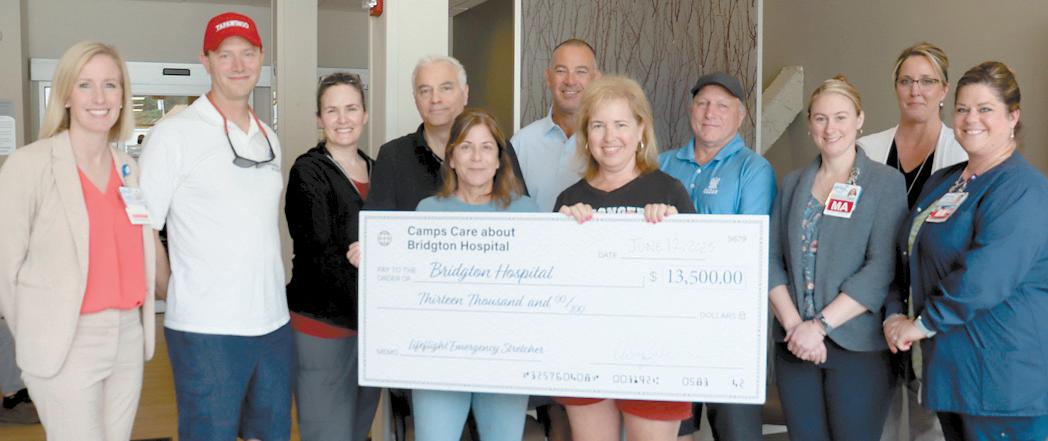 GENEROSITY TO HELP — Area summer camps raised $13,500 to help Bridgton Hospital purchase a stretcher for LifeFlight. Camp officials and Bridgton Hospital personnel pose for the ceremonial check presentation.