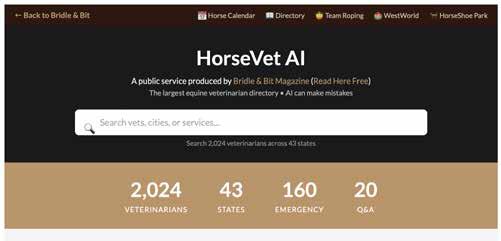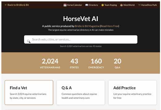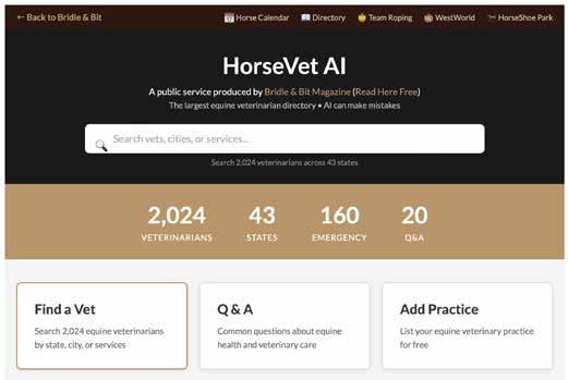 is Bridle & Bit Magazine’s free nationwide directory—search 2,000+ equine veterinarians, horse hospitals, and clinics anywhere in America. Find phone numbers, locations, services, and emergency options fast, whether you need routine care, a prepurchase exam, or urgent help on the road. Search by state, city, or specialty and connect directly with the right provider.
