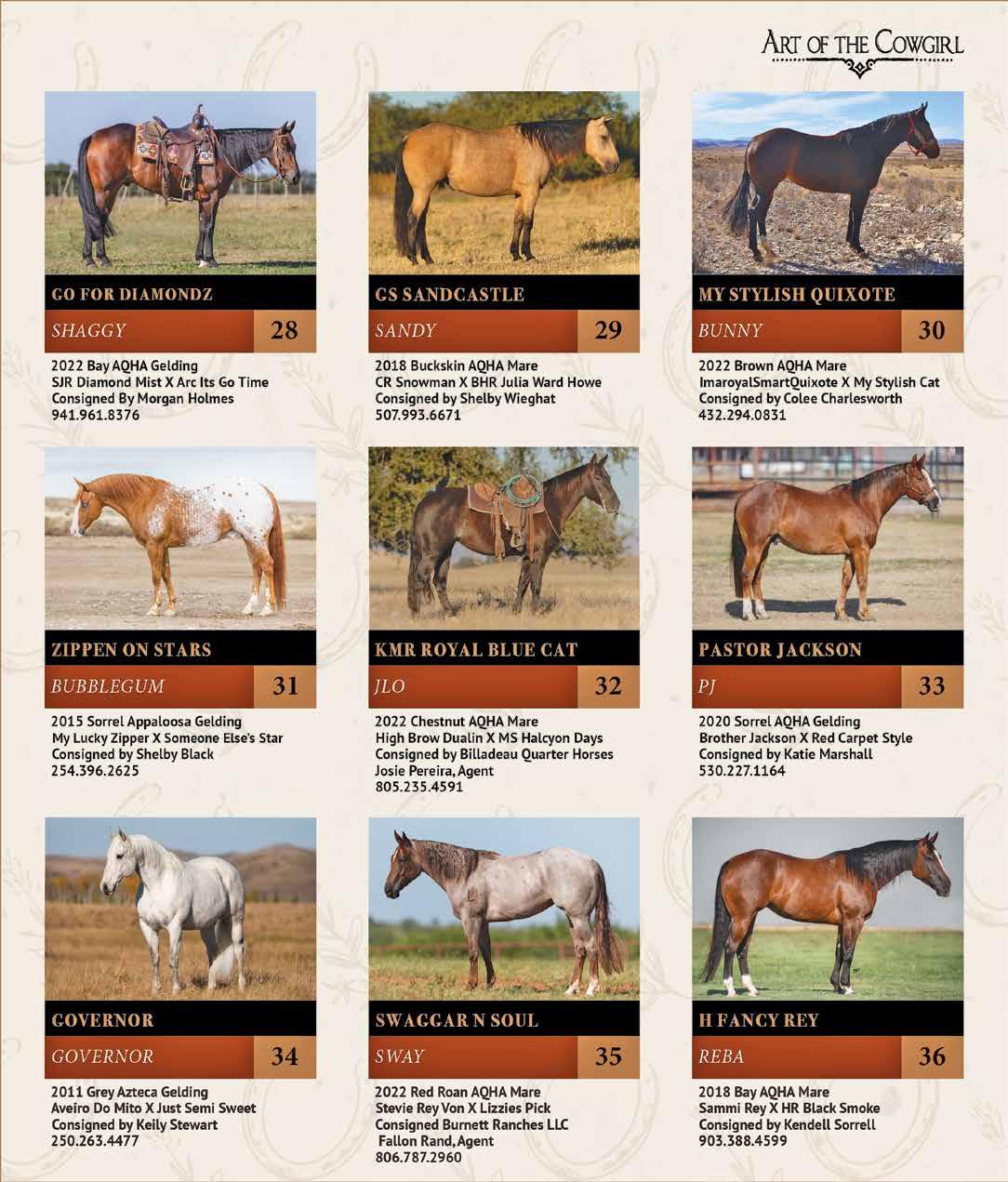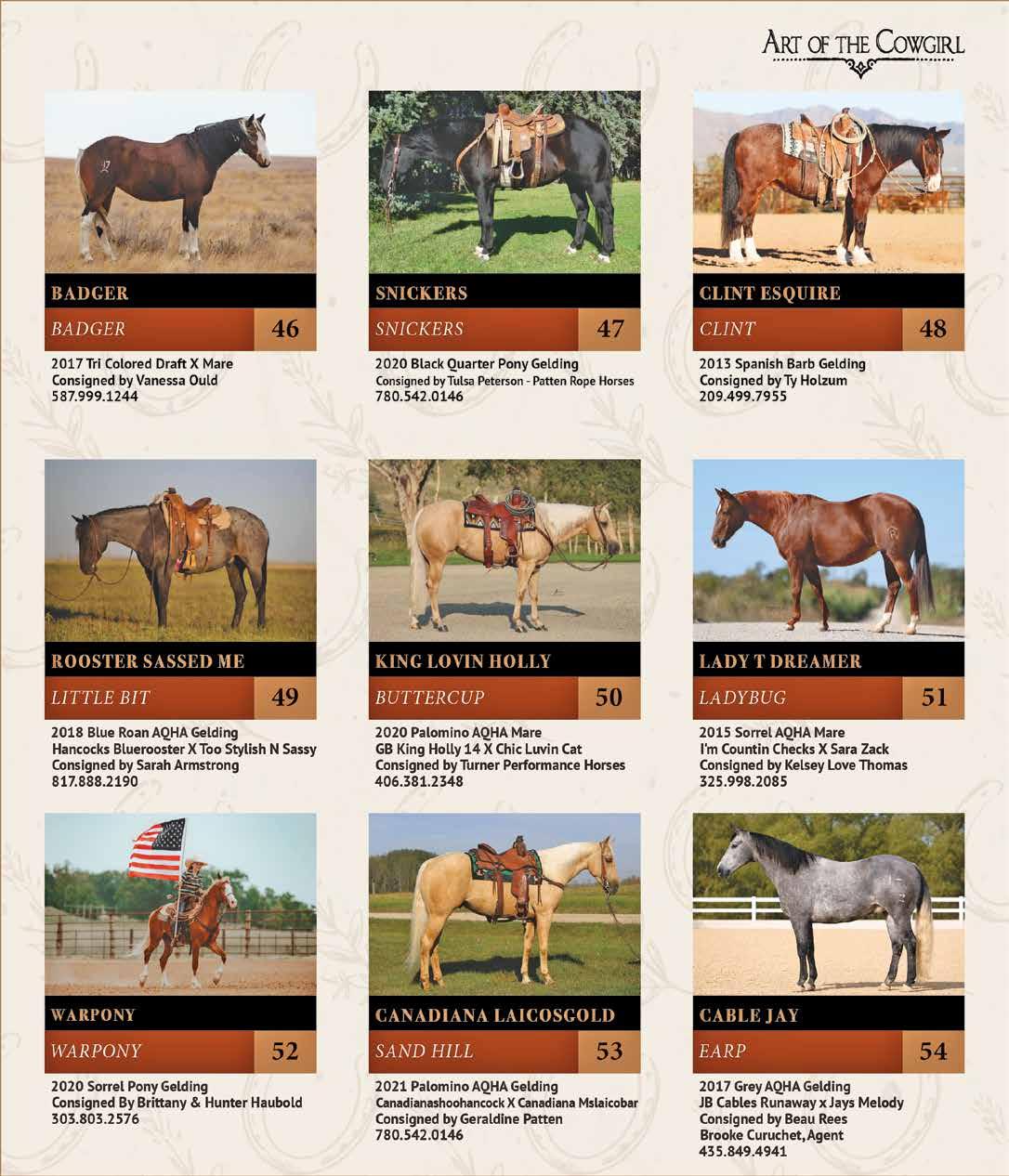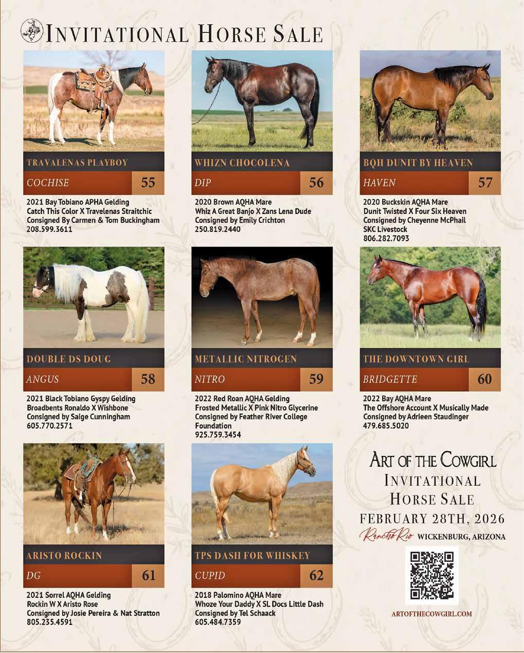 The event culminates with the Art of the Cowgirl Invitational Horse Sale, featuring Elite Horses and Cowkid Selects, all trained and consigned by cowgirls from across the U.S. and Canada. The sale begins Saturday at 4:00 p.m. in the Wrangler Pavilion, with online bidding available at cci.live.
