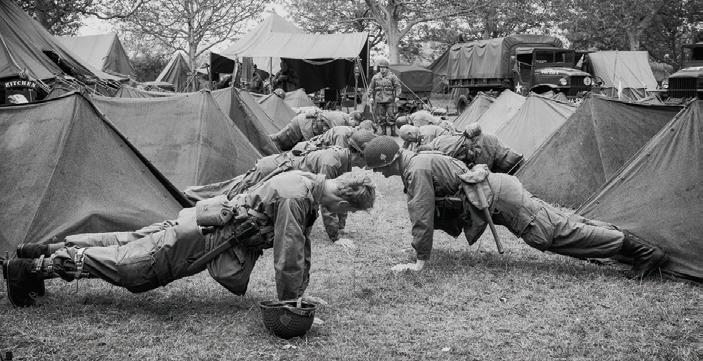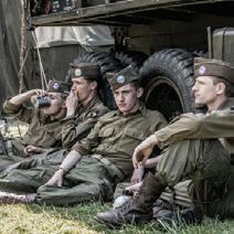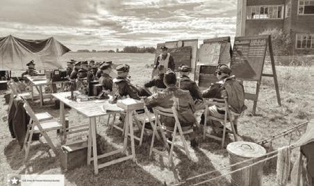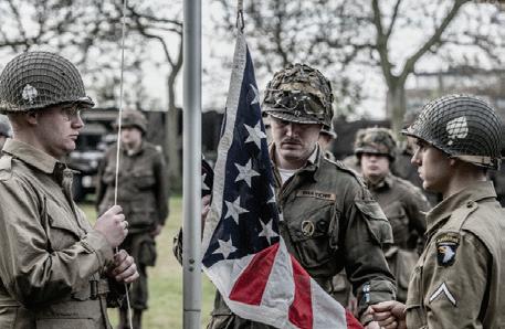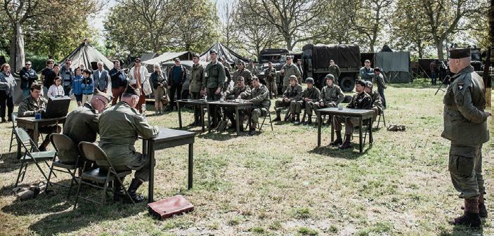 Leden van de re-enactmentvereniging beelden bemanning van Geallieerde vliegtuigen uit Hier ziet u een briefing voor de missie