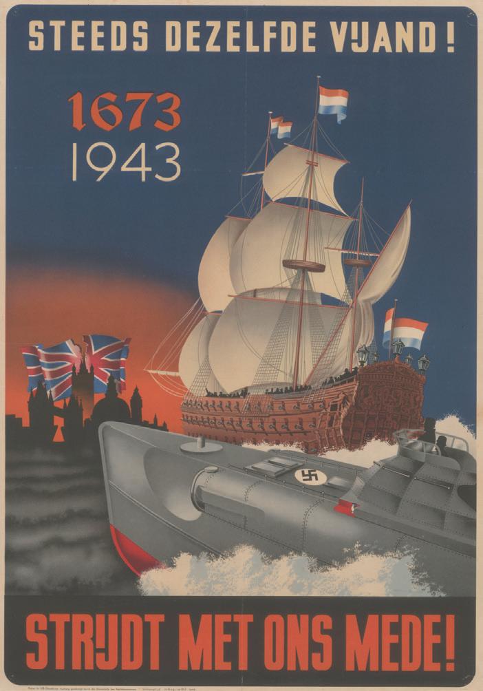 Gedurende de bezettingsjaren maakten de Duitsers op allerlei manieren verwijzingen naar dat gedeelde verleden Of ze trokken parallellen met historische gebeurtenissen om de oorlog te verantwoorden. Het affiche dat op last van de Reichskommissar van 15 augustus tot 10 oktober 1943 ook in Zwartewaal hing, laat wat dat betreft niets aan de verbeelding over: een 17e-eeuws oorlogsfregat trekt met een onderzeeër op tegen Engeland, vergezeld van de leuzen ‘1673-1943 Steeds dezelfde vijand’ en ‘Strijdt met ons mee’ Het verwees naar de Slag bij Kijkduin op 21 augustus 1673 w