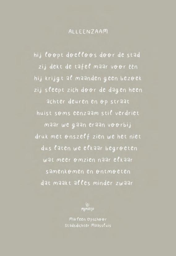 NetalsinderestvanNederlandmerkenwe dateenzaamheidsteedsmeeronderdeaandachtkomt.Eenzaamheidkomtvoorinalle leeftijdscategorieën.Wehorenbijvoorbeeld ookvanscholendatjongerenhetmoeilijk hebben.Eenbijvangstvandecoronaperiode isdatweallemaalzijngaanbeseffendatwe socialewezenszijnendatweelkaarnodig hebben.Iedereenheeftditgevoelervarenen snaptdathetbelangrijkisomcontactmet elkaartehebben.Allestukjeszorgzaamheid naarelkaartezamen,dragenbijaanintegratie, onderlingebetrokkenheidenhetterugdringen vaneenzaamheid.Ditdraagtuiteindelijk bijaandegezondheid,hetwelzijnende veiligheidvandeinwoners.”