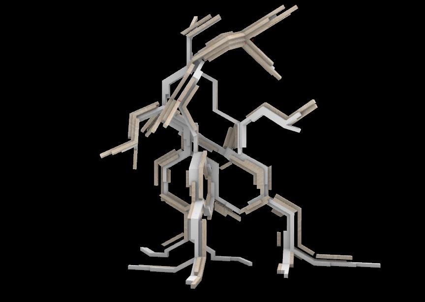 The turning pieces was kept with a 30 degree cut on the long side attached to rotate at-tached pieces. Unlike the prototyple, these parts were kept to a minimal to reduce the amount of cantilever in the final structure.