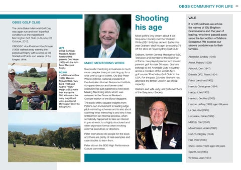 left OBGS Golf Club President, Nobby Forster (1960) presents Geof Hosie (1959) with the John Baker Memorial Trophy. below L to R Bruce McBriar (1966), Malcolm Titshall (1966), Tony Bond (1966) and Andrew “Wally” Weight (1963) make their way up the 18th with one of the many magnificent vistas provided at Mornington GC in the background.