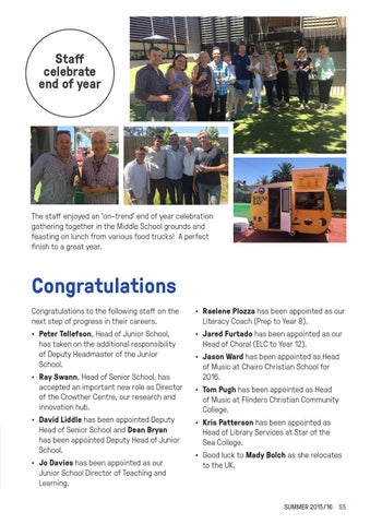 • Jason Ward has been appointed as Head of Music at Chairo Christian School for 2016. • Tom Pugh has been appointed as Head of Music at Flinders Christian Community College. • Kris Patterson has been appointed as Head of Library Services at Star of the Sea College. • Good luck to Mady Bolch as she relocates to the UK.