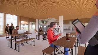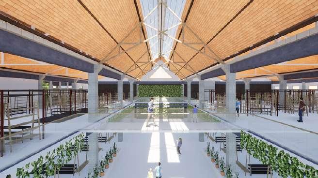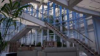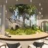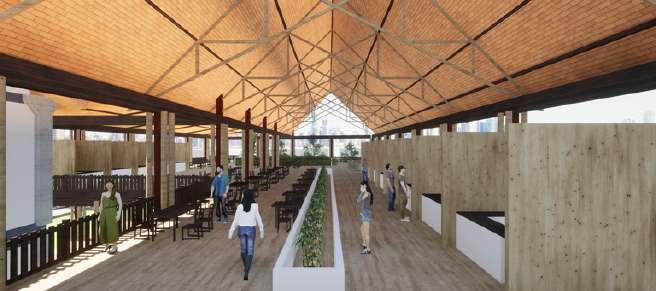Rancangan pada interior bangunan utama dan foodcourt diterapkan vegetasi untuk merespon parameter Biophilic design " koneksi visual dengan alam". Pada area sepanjang koridor bangunan utama terdapat Vertical Garden English Ivy. Terdapat tanaman Areca dan spider plant yang menggantung di sepanjang koridor, begitu juga dengan bangunan foodcourt terdapat void yang diletakkan vegetasi spider plant guna meningkatkan kelembaban pada ruang untuk meminimalisir penyebaran virus covid 19 Untuk menjaga agar tanaman tetap hidup menggunakan sistem hidroponik pada rancangan.