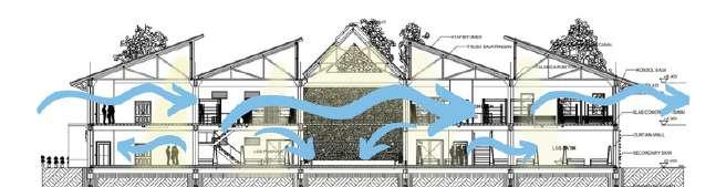 Pada bangunan utama terdapat ventilasi sebagai cross ventalition untuk merespon parameter biophlic design Thermal dan variasi aliran udara. Memasukan udara alami pada ruangan dan pertukaran udara alami dapat meminimalisir penyebaran vrus covid 19.