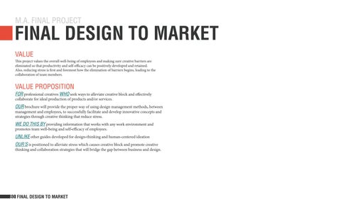 FINAL DESIGN TO MARKET VALUE This project values the overall well-being of employees and making sure creative barriers are eliminated so that productivity and self-efficacy can be positively developed and retained. Also, reducing stress is first and foremost how the elimination of barriers begins, leading to the collaboration of team members.