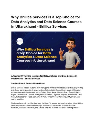 Brillica Services is a trusted training institute that helps students learn modern IT skills in a simple and practical way. The institute offers many popular courses like Data Science, Data Analytics, Power BI, Full Stack Web Development, Python, Machine Learning, Cloud Computing, Cyber Security, and more. Brillica Services focuses on hands-on learning, real projects, expert trainers, and career support so every student can build a strong future in the tech industry. It is known for quality training, updated course content, and guiding students toward good career opportunities. Phone Number - 088821 40688 Address - Opposite bank of india, PNB Vihar, Majra, Dehradun, Shewala Kala, Uttarakhand 248171