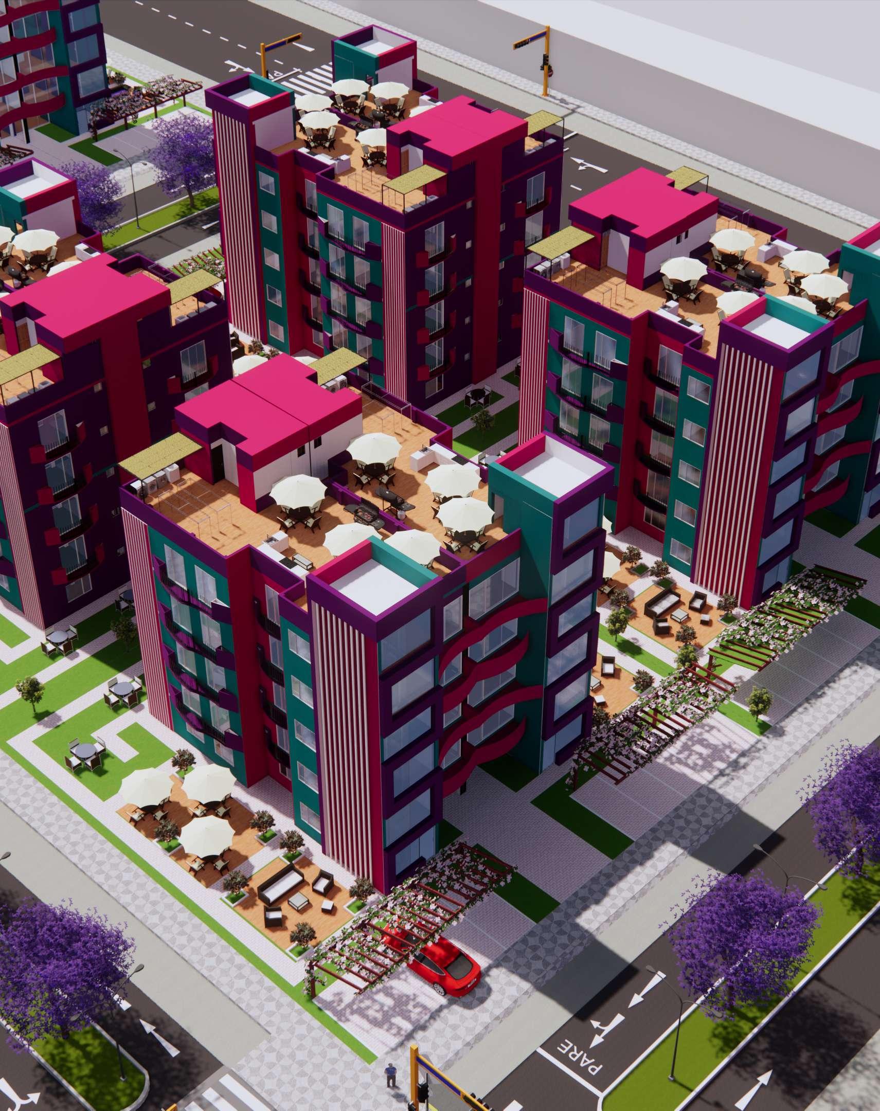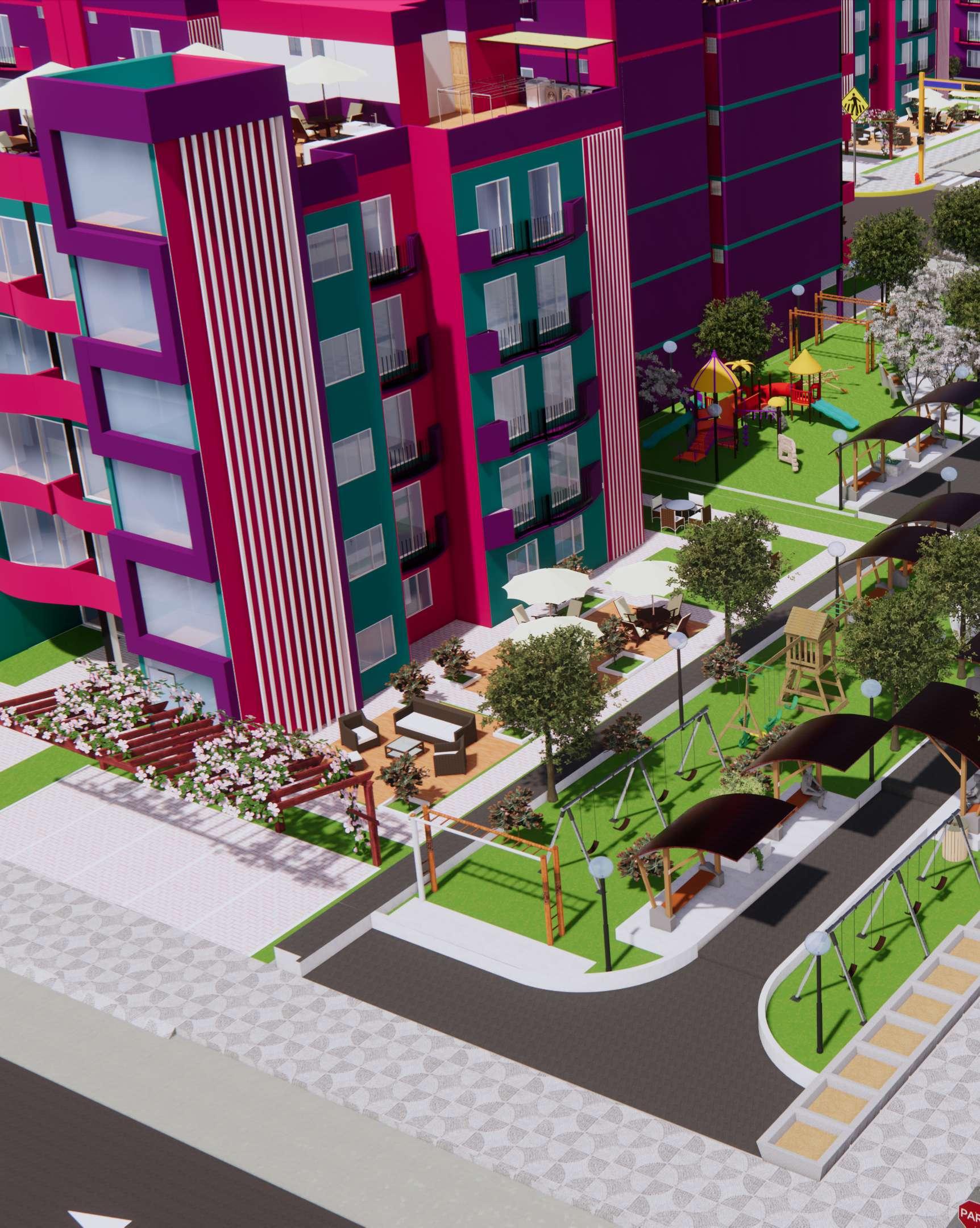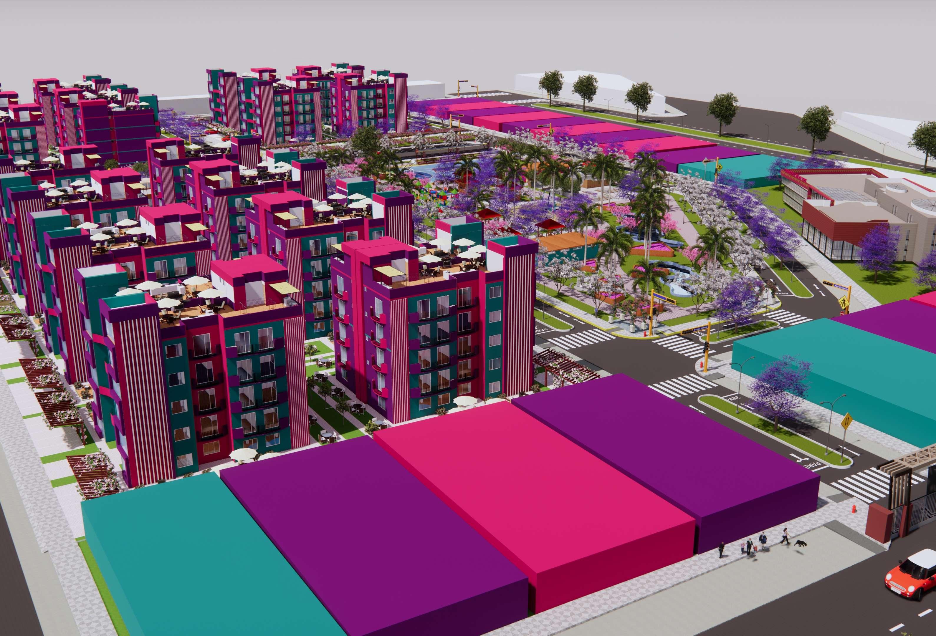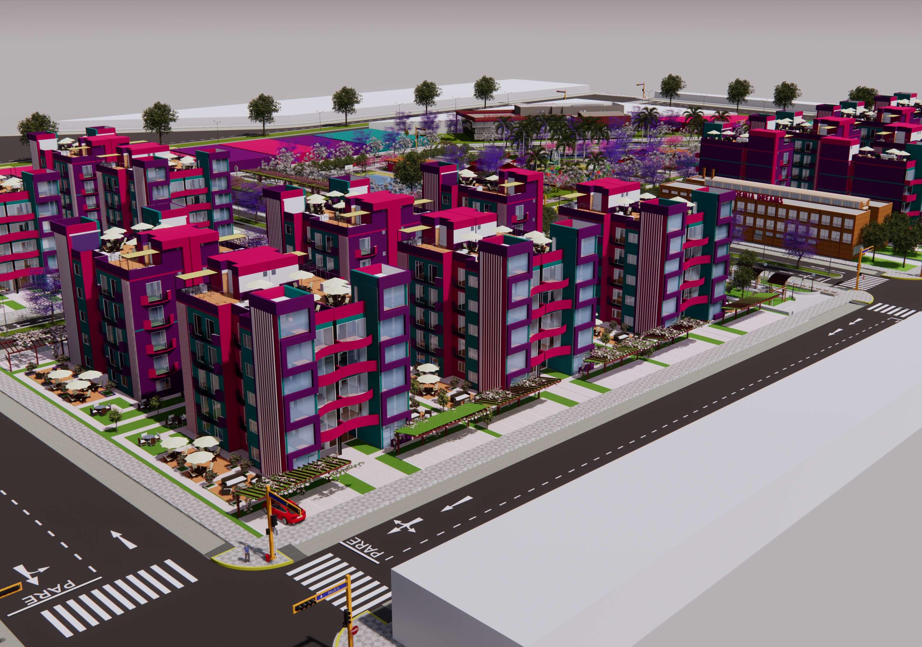 Pasamos de los aportes a los módulos de viviendas multifamiliares cuya área es de 450 m2, de frente posee 15 ml por 30 ml de ancho, estos cuentan con 5 pisos más una azotea, estos módulos llaman la atención principalmente por sus colores, que encajan perfectamente con el nombre de la habilitación, el entorno y vegetación, el color morado predomina, cuyo significado es la imaginación y creatividad, el rosado es encanto, amabilidad, ternura, y dulzura, el color verde lo asociamos a la tranquilidad, calma y se asocia con la naturaleza