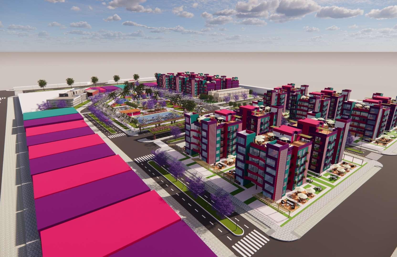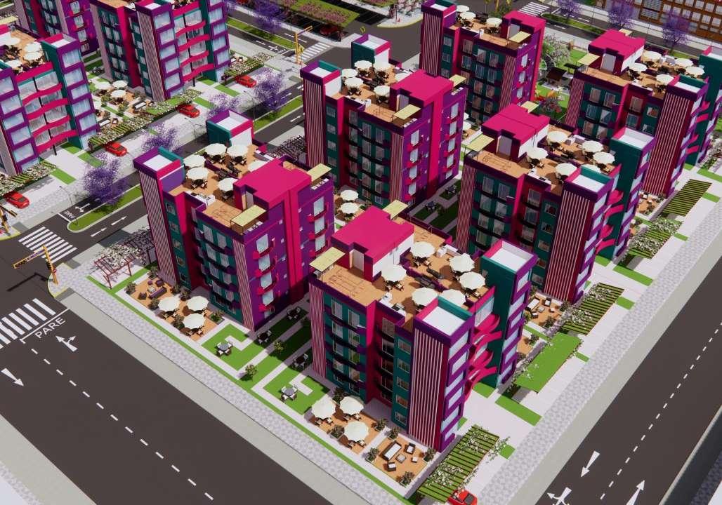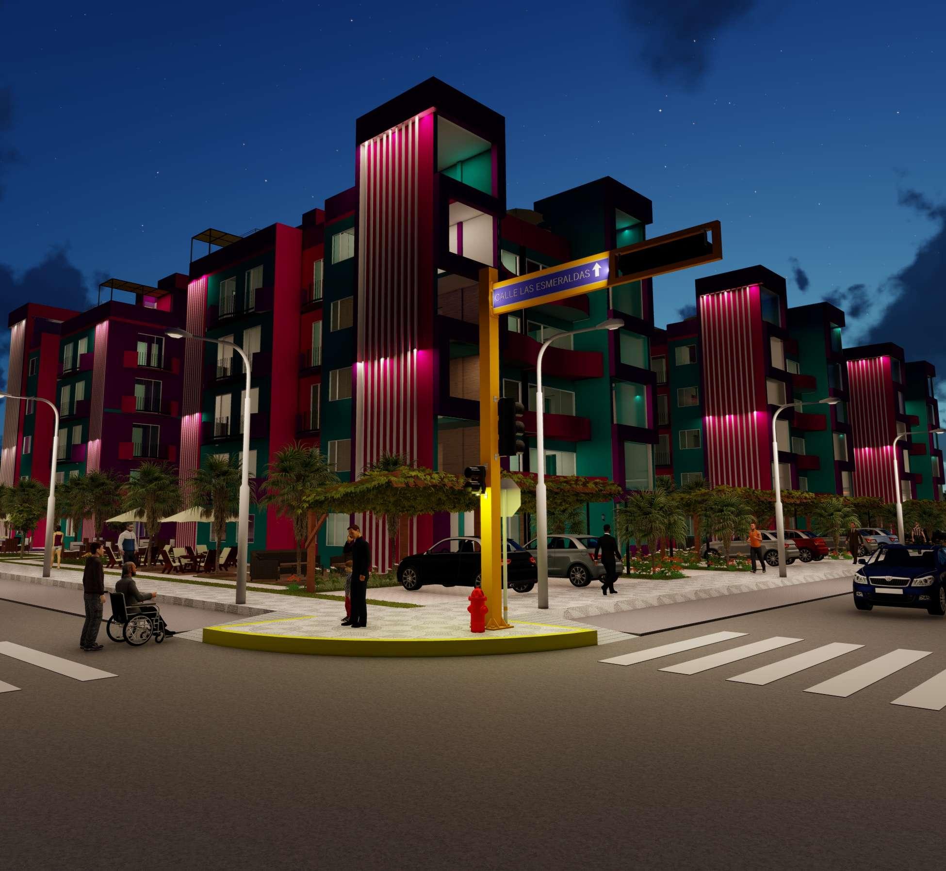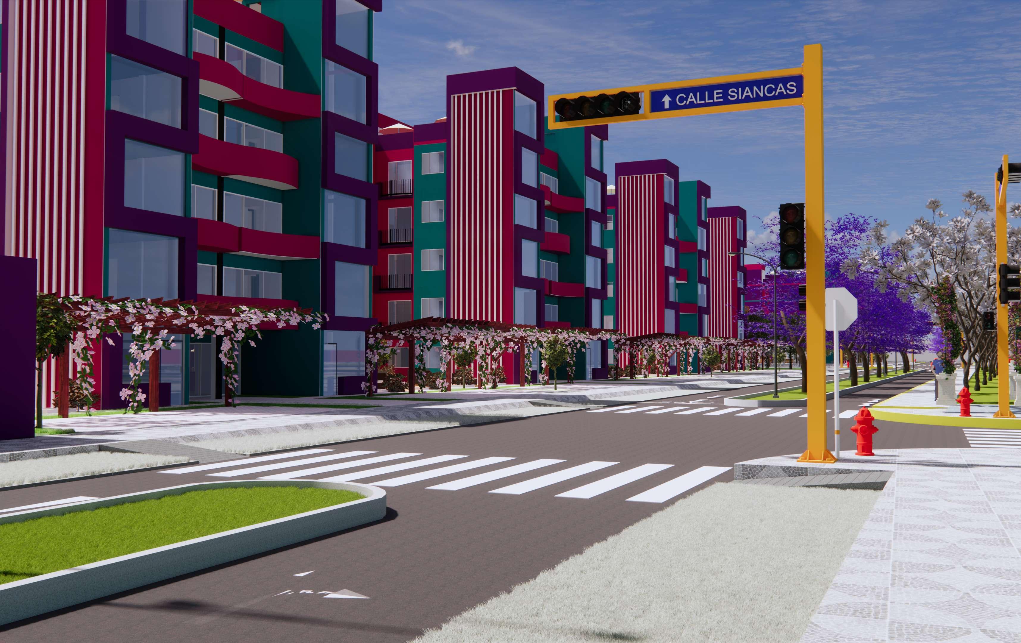 Pasamos de los aportes a los módulos de viviendas multifamiliares cuya área es de 450 m2, de frente posee 15 ml por 30 ml de ancho, estos cuentan con 5 pisos más una azotea, estos módulos llaman la atención principalmente por sus colores, que encajan perfectamente con el nombre de la habilitación, el entorno y vegetación, el color morado predomina, cuyo significado es la imaginación y creatividad, el rosado es encanto, amabilidad, ternura, y dulzura, el color verde lo asociamos a la tranquilidad, calma y se asocia con la naturaleza