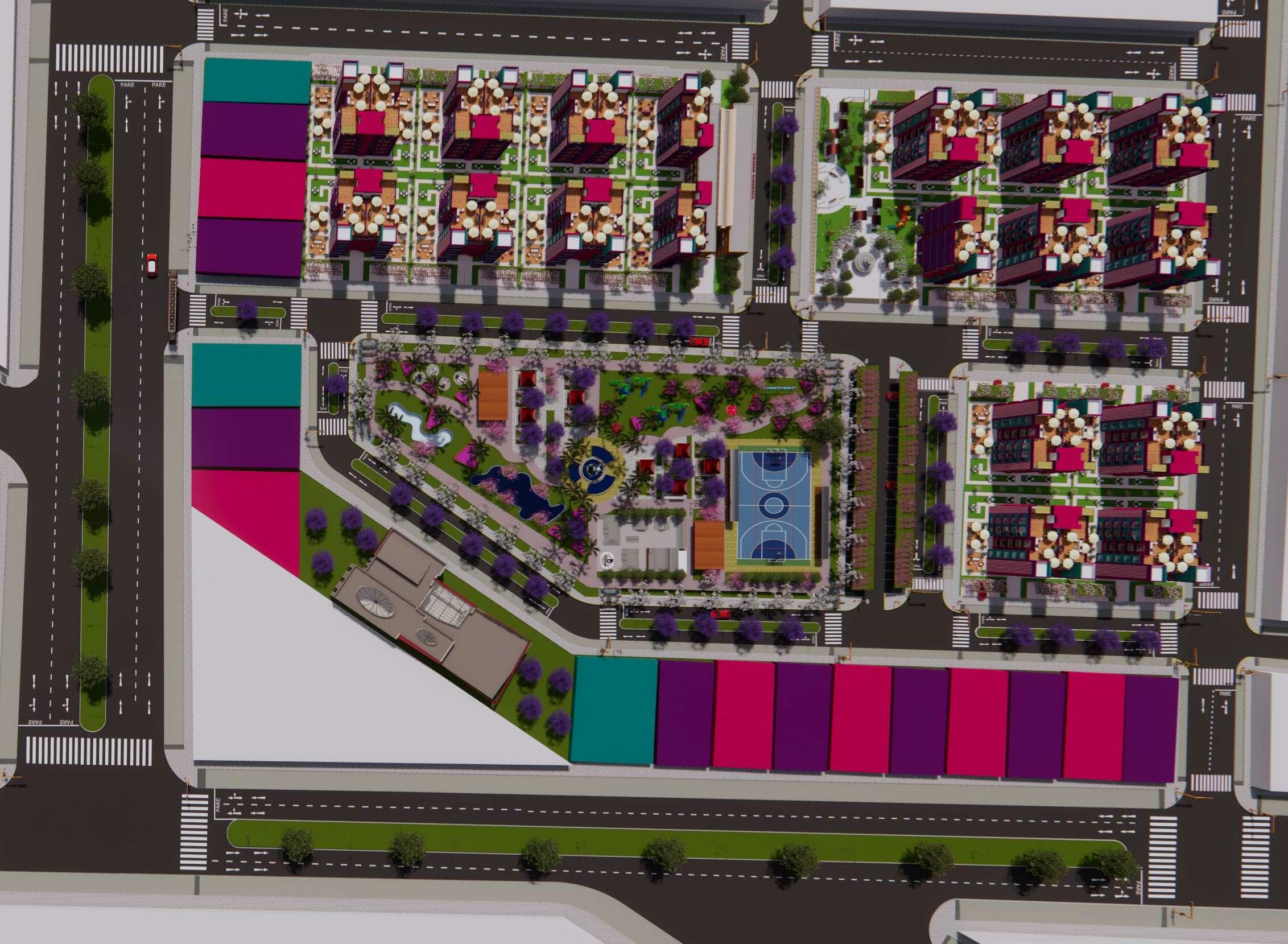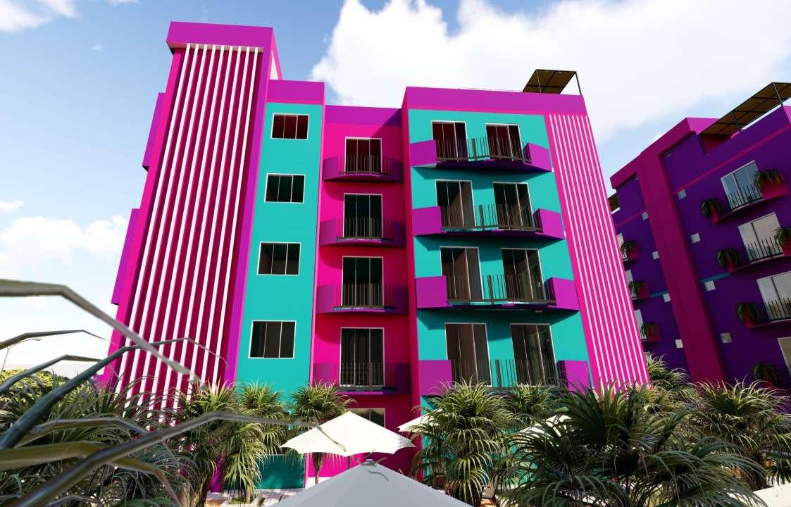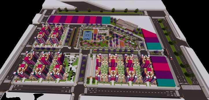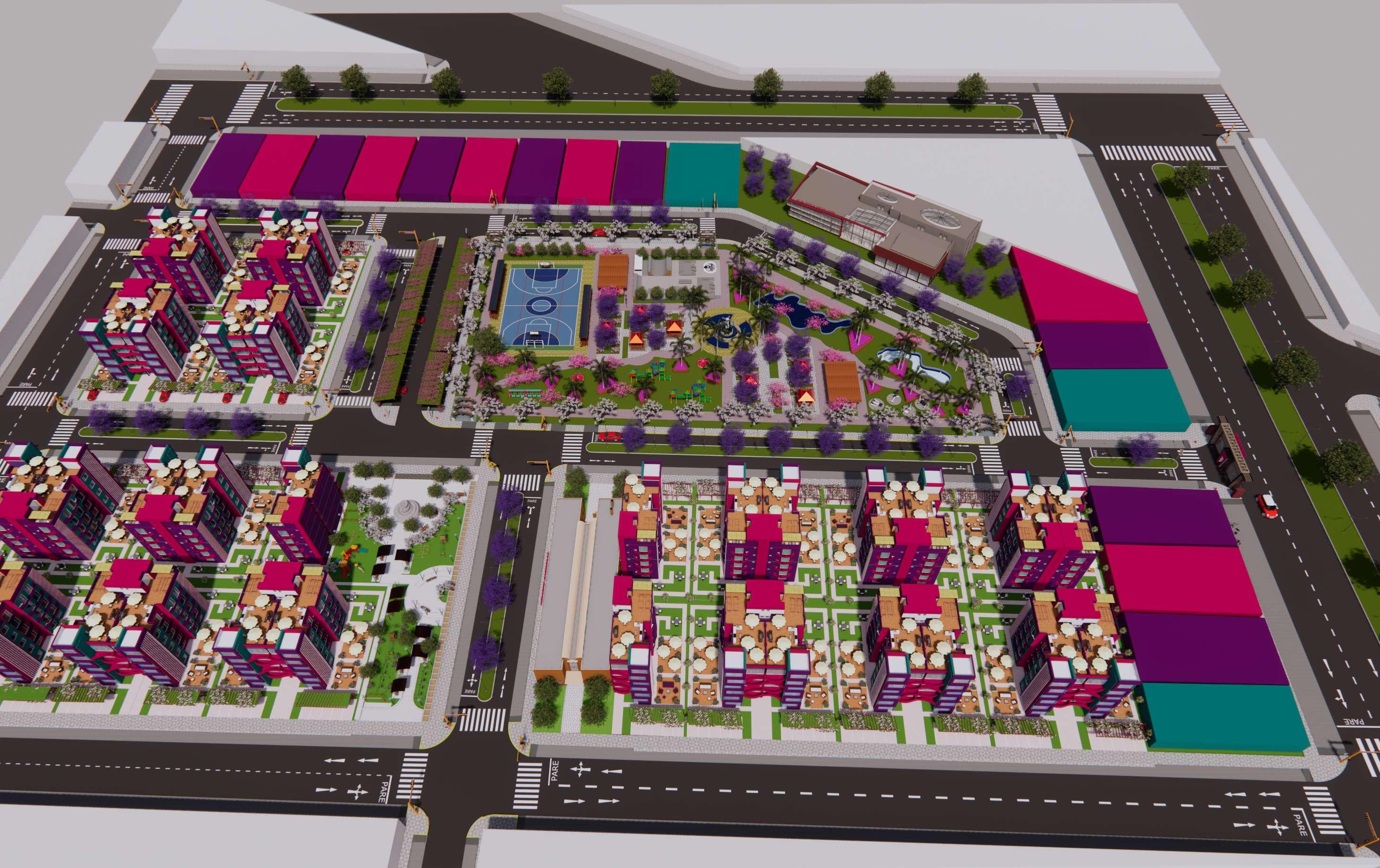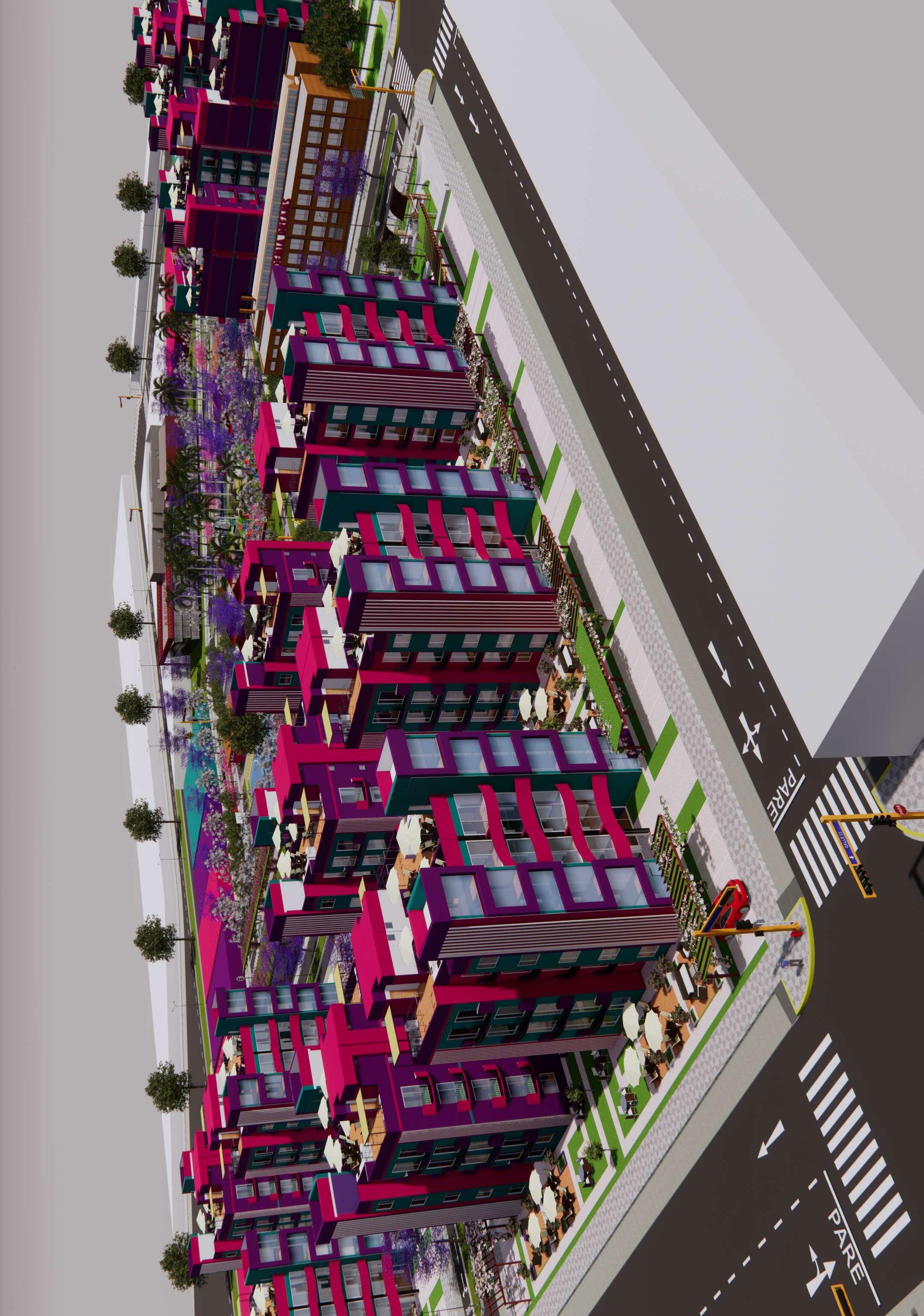 Pasamos de los aportes a los módulos de viviendas multifamiliares cuya área es de 450 m2, de frente posee 15 ml por 30 ml de ancho, estos cuentan con 5 pisos más una azotea, estos módulos llaman la atención principalmente por sus colores, que encajan perfectamente con el nombre de la habilitación, el entorno y vegetación, el color morado predomina, cuyo significado es la imaginación y creatividad, el rosado es encanto, amabilidad, ternura, y dulzura, el color verde lo asociamos a la tranquilidad, calma y se asocia con la naturaleza
