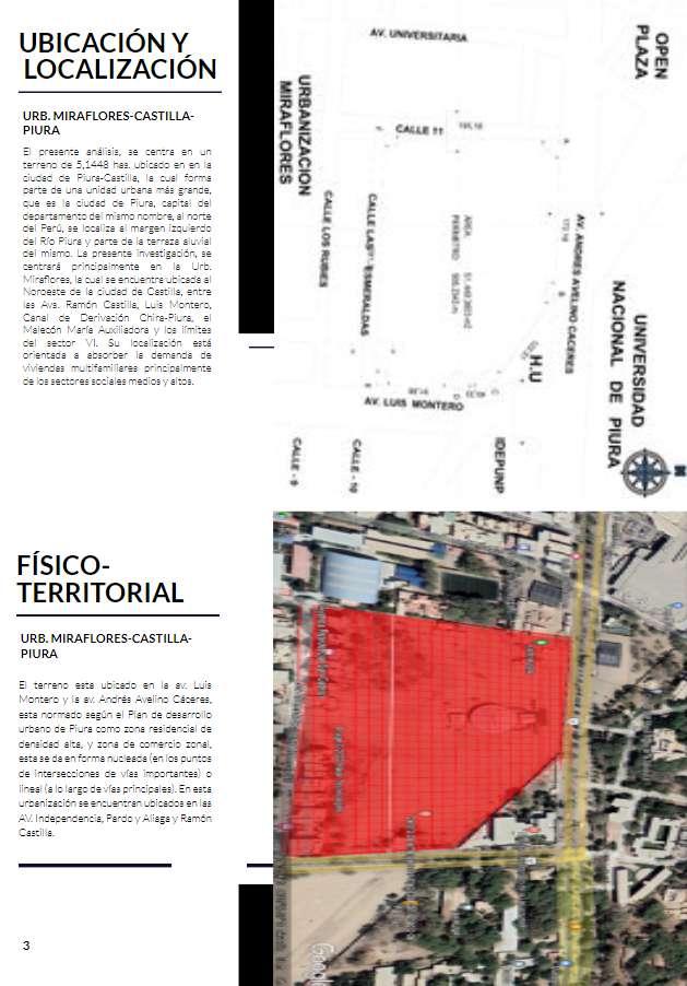 El presente proyecto, se centra en un terreno de 5,1448 has. ubicado en en la ciudad de Piura-Castilla, la cual forma parte de una unidad urbana más grande, que es la ciudad de Piura, capital del departamento del mismo nombre, al norte del Perú, se localiza al margen izquierdo del Río Piura y parte de la terraza aluvial del mismo. La presente investigación, se centrará principalmente en la Urb. Miraflores, la cual se encuentra ubicada al Noroeste de la ciudad de Castilla, entre las Avs. Ramón Castilla, Luis Montero, Canal de Derivación Chira-Piura, el Malecón María Auxiliadora y los límites del sector VI. Su localización está orientada a absorber la demanda de viviendas multifamiliares principalmente de los sectores sociales medios y altos.