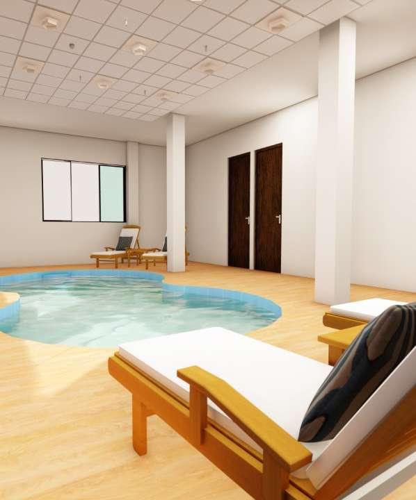 en el primer nivel encontramos las escaleras Página 9 de 49 y ascensor que nos llevan a los pisos superiores, un cuarto para máquinas con un área de 8.04m2, así también un salón multiusos al lado de una piscina curva, que cuenta con su respectivo mobiliario, sus baños y vestidores, con un área total de 89.53m2.