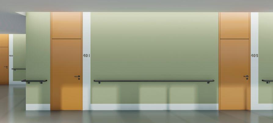 2 | Durch den Einsatz von Farbtönen mit kontrastreicherem Hellbezugswert, z. B. am Handlauf, wird den Anforderungen der DIN 18040-1 entsprochen. Fehlt der nötige Kontrast zwischen Tür, Wand und Boden, lässt sich dieser durch kontrastreiches Absetzen, zum Beispiel mit einem abgetönten Weiß, herstellen.
