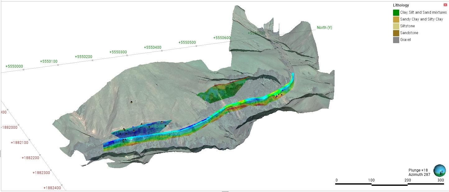 Geophysics data interpreted with leading software Leapfrog against the digital terrain model including the road alignment, revealed areas with soft (blue)