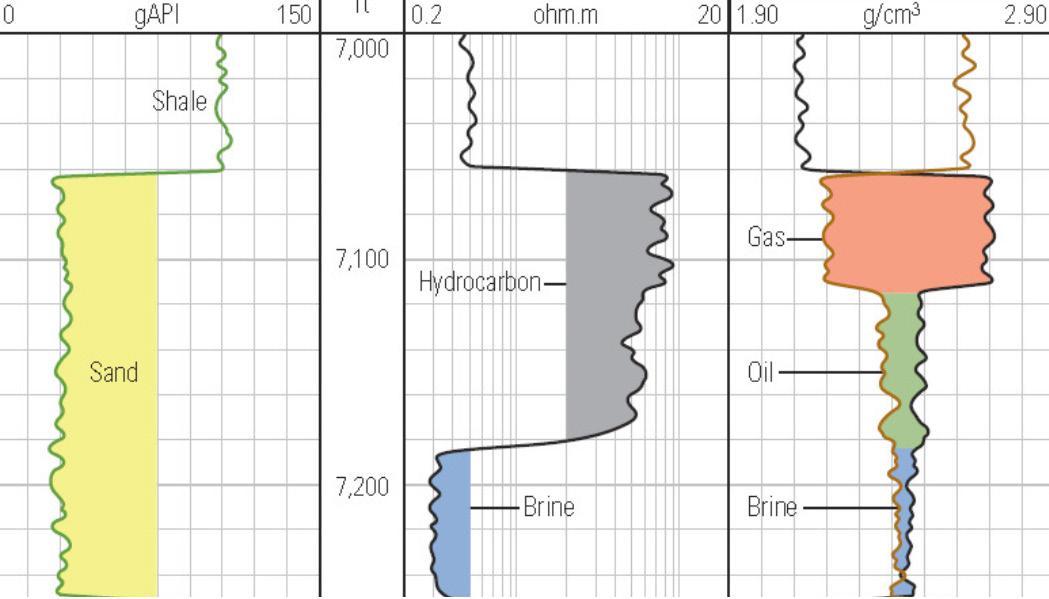 7: Simplified characteristic response of gamma Ray, resistivity and density logging tools over a sandstone reservoir filled with gas, oil and brine. (After Oil Field Review, Schlumberger, Spring 2011)
