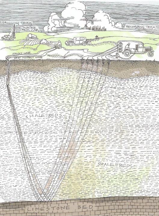 Figure 1: From a firing point, an explosive source create seismic waves that travel down through the rock strata where they bounce of boundaries between different rock types and reflect back to surface to be detected by receivers called geophones. (After Mau and Edmundson in Exploring for Oil and Gas, 2014) Page 12 >