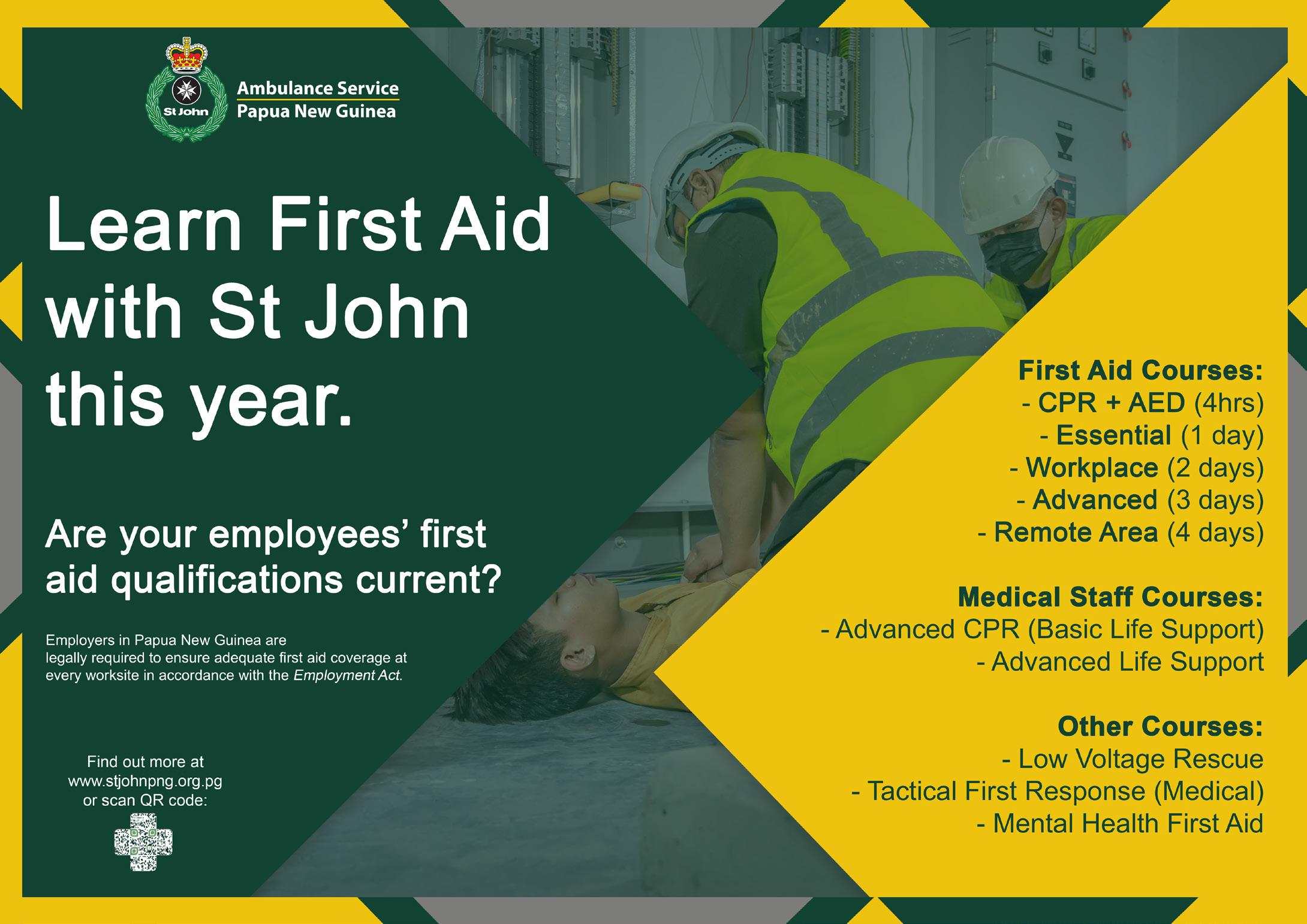 The Papua New Guinea St John Ambulance provides training routinely in Port Moresby and Lae, and can facilitate training at any location in PNG, which makes it easy for workers to gain or maintain their first aid qualifications.