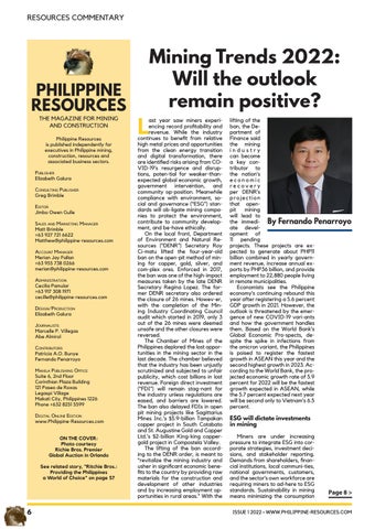 lifting of the ban, the Department of Finance said the mining industry can become a key contributor to the nation’s economic recovery per DENR’s projection that openpit mining will lead to the immedi- By Fernando Penarroyo ate development of 11 pending projects. These projects are expected to generate about PHP11 billion combined in yearly government revenue, increase annual exports by PHP36 billion, and provide employment to 22,880 people living in remote municipalities. Economists see the Philippine economy’s continuing rebound this year after registering a 5.6 percent GDP growth in 2021. However, the outlook is threatened by the emergence of new COVID-19 vari-ants and how the government handles them. Based on the World Bank’s Global Economic Pro-spects, despite the spike in infections from the omicron variant, the Philippines is poised to register the fastest growth in ASEAN this year and the second highest growth in 2023. According to the World Bank, the projected economic growth rate of 5.9 percent for 2022 will be the fastest growth expected in ASEAN, while the 5.7 percent expected next year will be second only to Vietnam’s 6.5 percent. ESG will dictate investments in mining Miners are under increasing pressure to integrate ESG into corporate strategies, investment decisions, and stakeholder reporting. Demands from shareholders, financial institutions, local communi-ties, national governments, customers, and the sector’s own workforce are requiring miners to ad-here to ESG standards. Sustainability in mining means minimizing the consumption