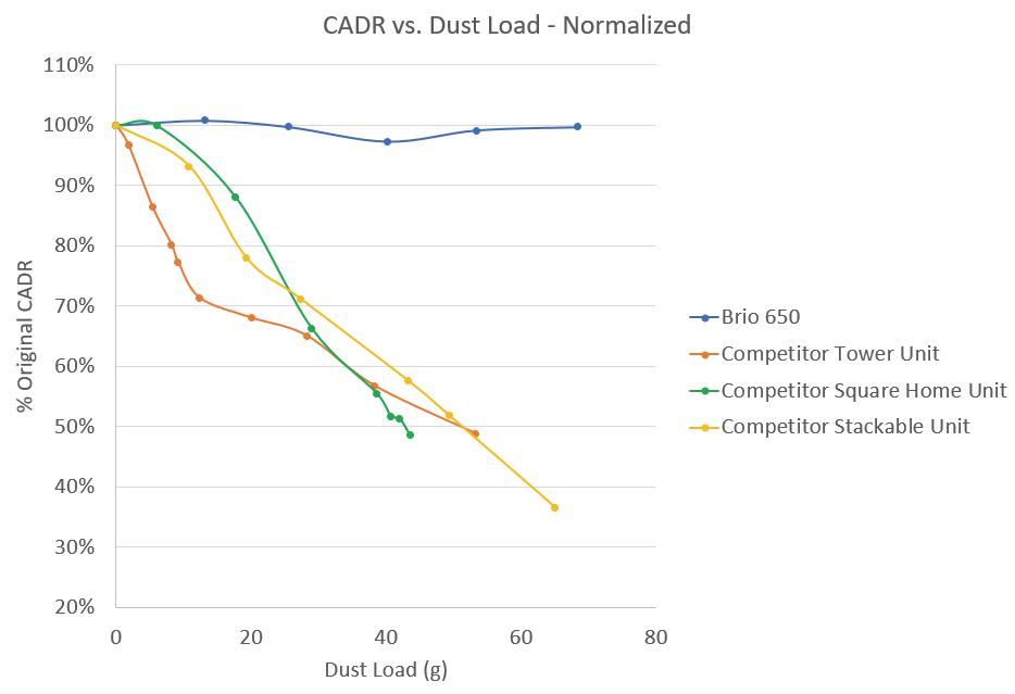 In performance tests, Brio 650 kept the air purification at 100 percent of the original clean air delivery rate, meaning there was no performance dropo as it trapped over 60 grams of fine dust. HEPA air purifiers tested saw a rapid drop to only 50% of original CADR. Which one would you like to use for better indoor air?