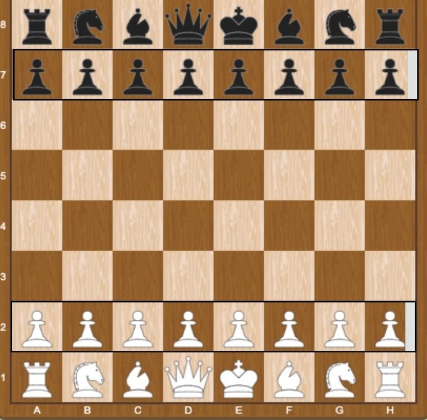 Lastly, let's talk about placing the pawns. All pawns are placed on the row in front of the other pieces, filling up the entire row. Pawns move one square forward and cannot move back. A pawn may advancetwosquaresonitsfirst move.
