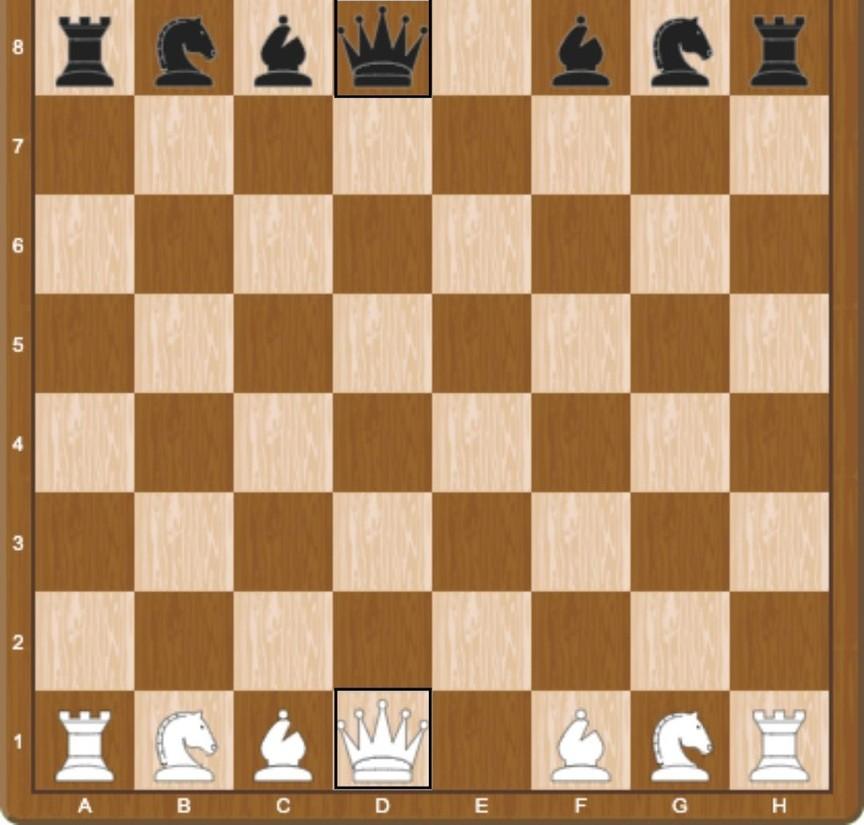 Now, let's address the queen. The queen is placed on the remaining square of her color. This means the white queen starts on the light square, and the black queen on the dark square. The queen can be moved any number of unoccupied squares in a straight line vertically, horizontally, or diagonally.
