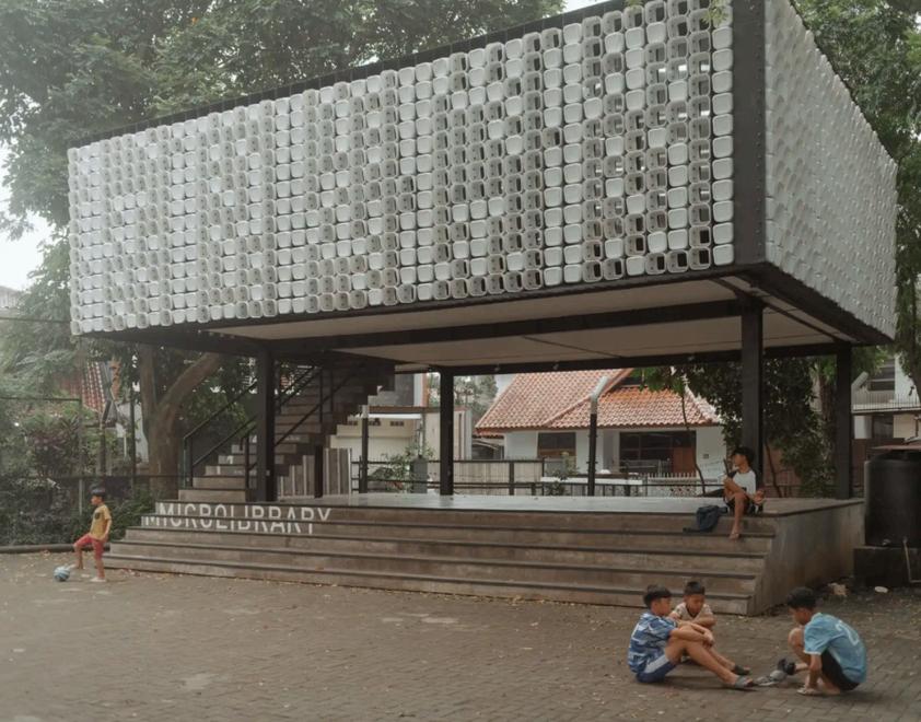 Otro ejemplo es la biblioteca Bima, también en Indonesia, ya que emplea 2.000 baldes de helado reciclados en su fachada, creando un muro translúcido que filtra luz y aumenta la ventilación
