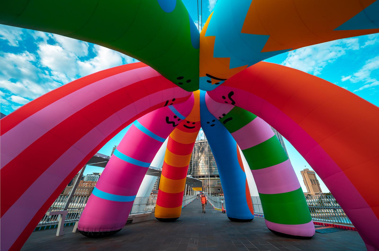 In a vibrant city-wide transformation, the duo reimagined iconic Brisbane landmarks and walking bridges with their signature pop art sensibility — a joyful collision of pattern, form, and vivid colour.