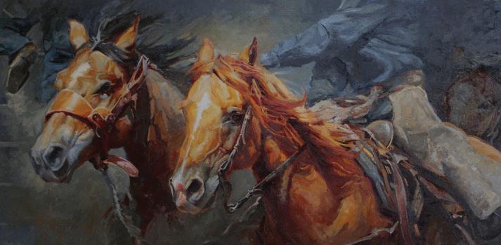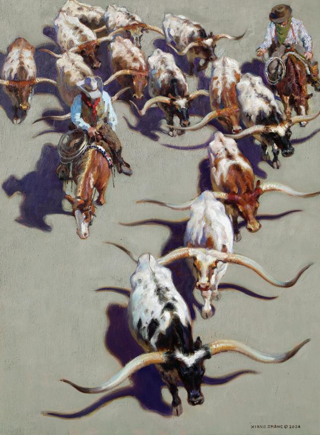 Born in the year of the Horse, Xiang Zhang (pronounced “Shong Zang”) grew up in China. After graduating from the Central Academy of Drama in Beijing, he received a master of fine arts degree from Tulane University in New Orleans. Upon moving to Texas, Zhang combined his love for painting horses and portraiture to develop his art. Based on his observations on working ranches, his work reflects the symbiotic relationship between the cowboy and his horse. Using scintillating colors and bravura brushwork to capture the drama of ranch life, he has created a definitive style that has catapulted him to new heights in the art world.