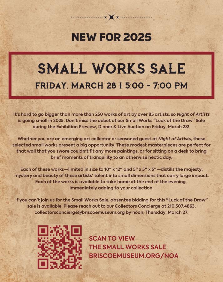Proceeds from Night of Artists allow the Briscoe Western Art Museum to grow its impact, enabling dynamic exhibitions, engaging programming, and educational opportunities that reach children, students, and families throughout the year.