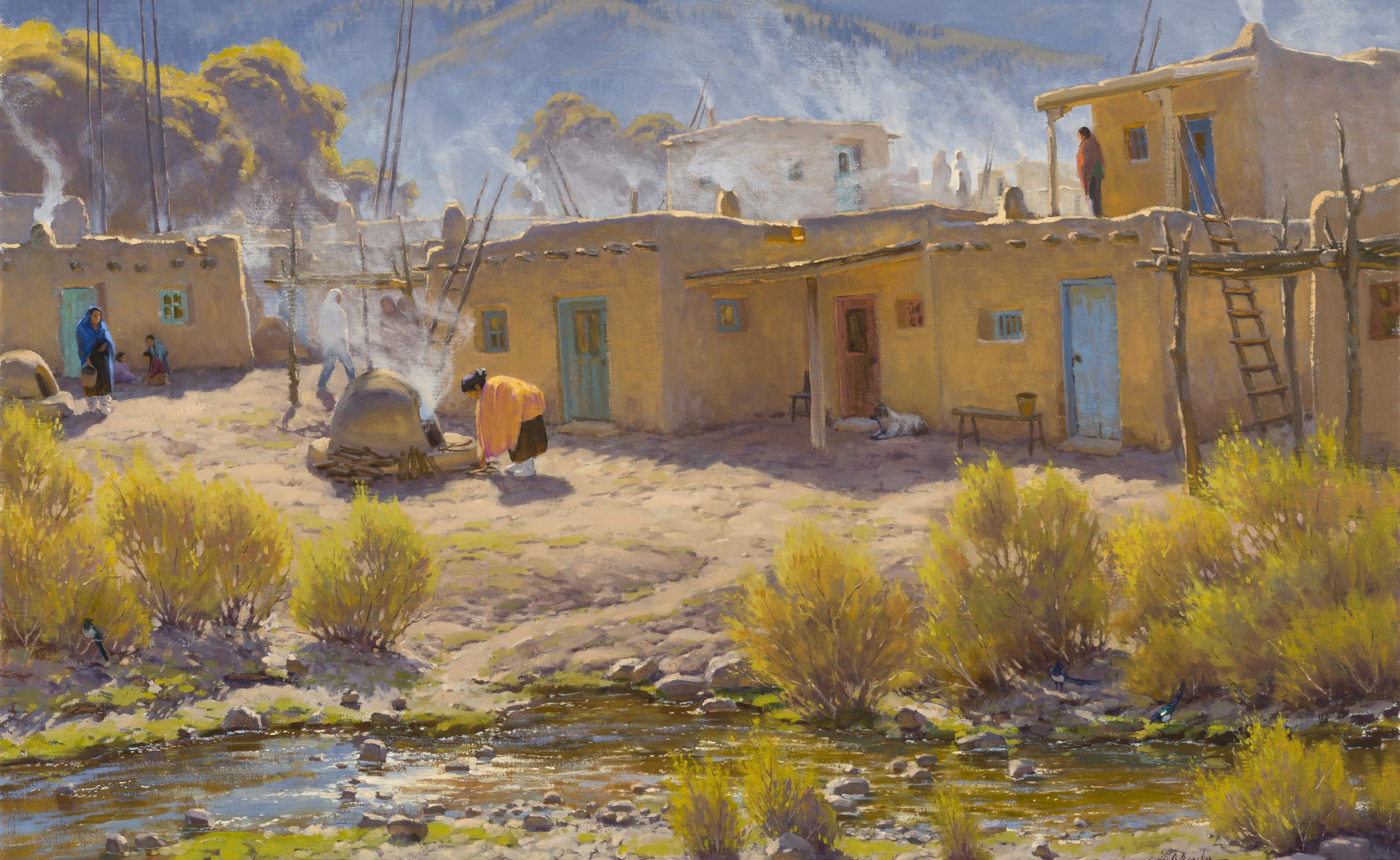 Ron Rencher, Morning Fires, Taos Pueblo, Oil on linen, 36” x40” (detail)