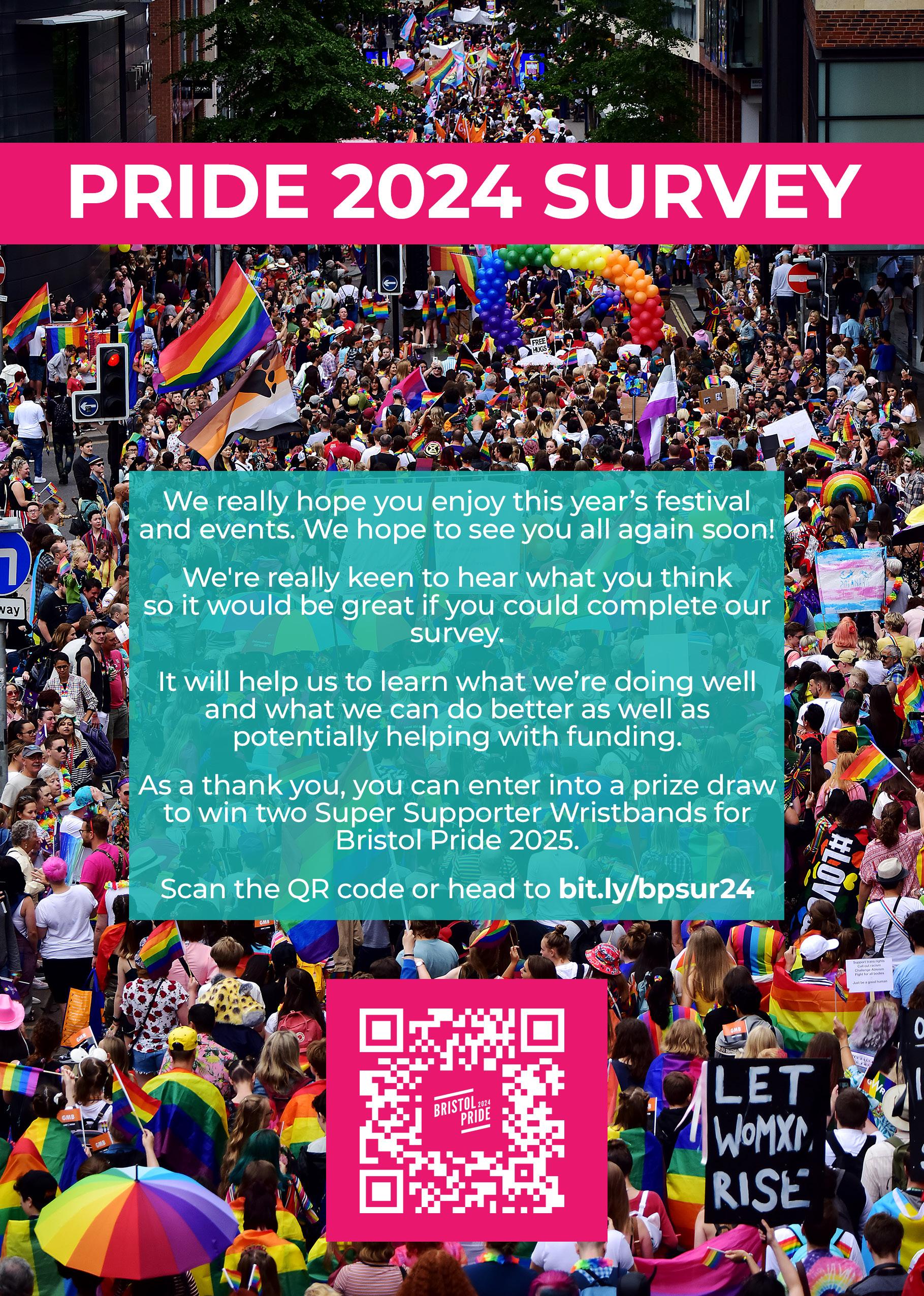 We can’t wait to welcome you to events this year, and you’ll see it’s another bumper year of events across the 2 weeks of the festival and Pride Day. Cost of living is affecting us all and we’ve worked hard to keep prices down as much as possible, and Pride day remains donation entry but please, if you can, buy one of our supporter wristbands. Your support keeps Pride happening and wristbands offer great rewards like free bus travel across Bristol on Pride Day and money off bar prices at the festival. Do also make sure you get out and support the LGBT+ venues and events over the Pride Fortnight.