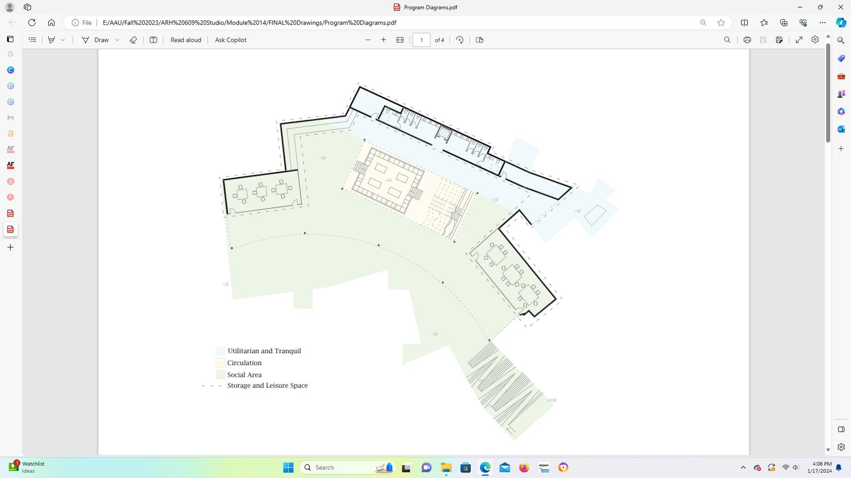 The spaces required are divided according to their purposes and usage. The first level is devoted to public spaces, where louder conversations and noise are acceptable.