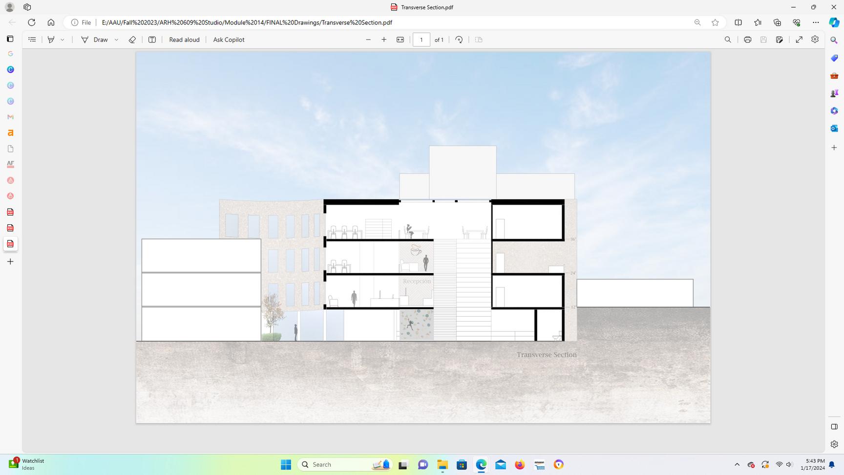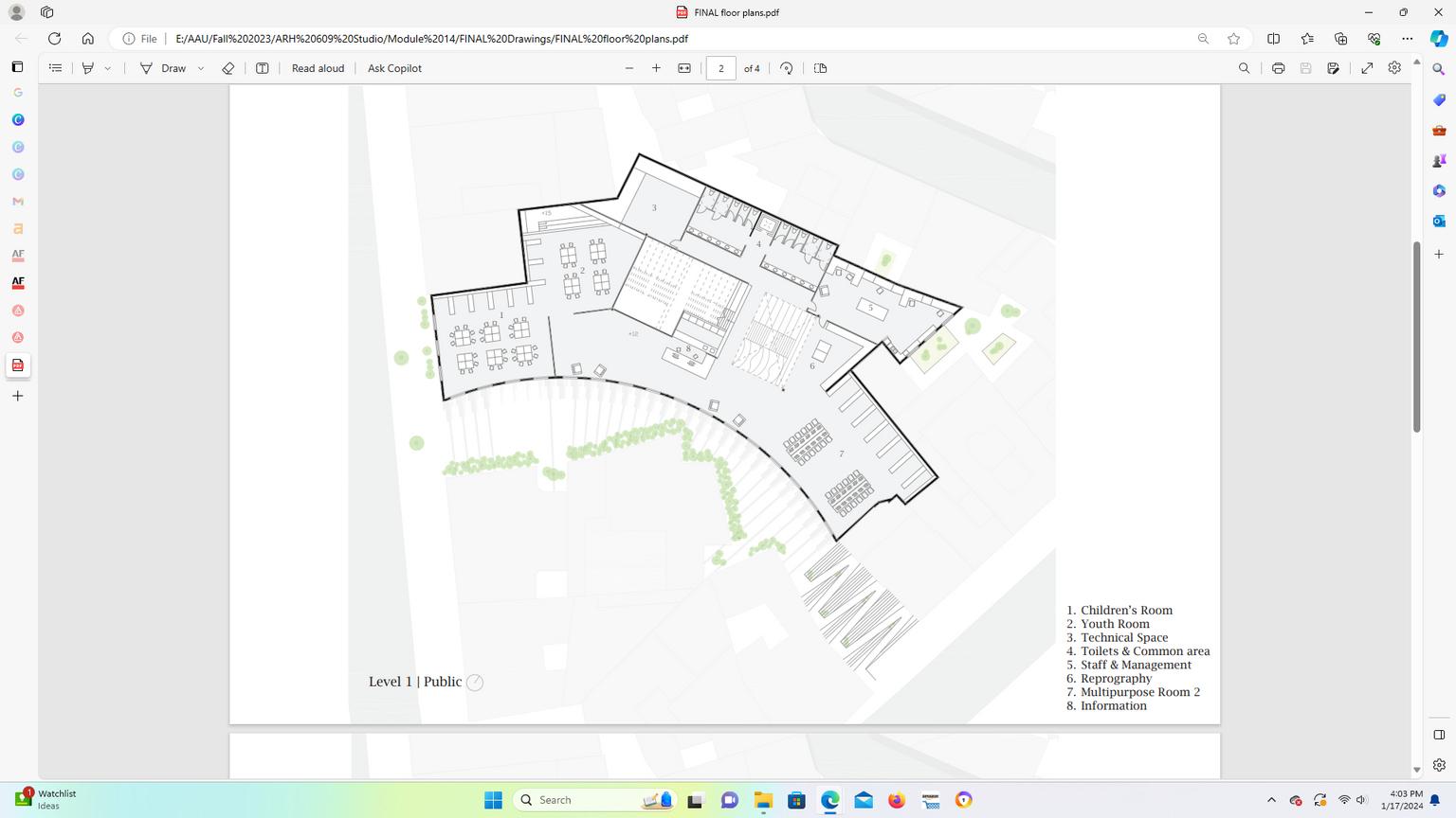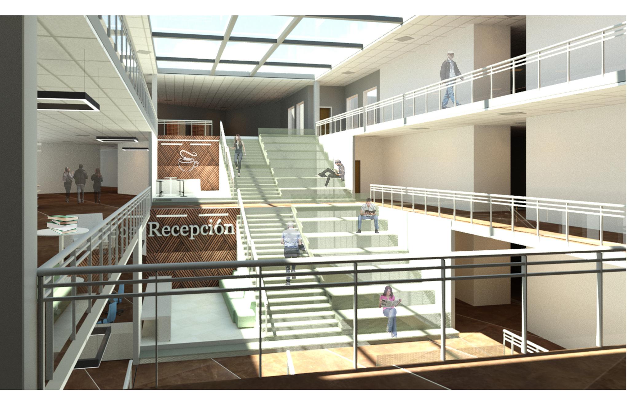 To ensure that natural light illuminates the entire library, an opening has been incorporated above the main circulation area. This will enable the light to radiate from the circulation area into all the other sections of the library, ensuring that the entire interior is well lit with natural light. The staircase is constructed using a perforated metal material, enabling the filtration of light to illuminate both the ground level and sunken pit area