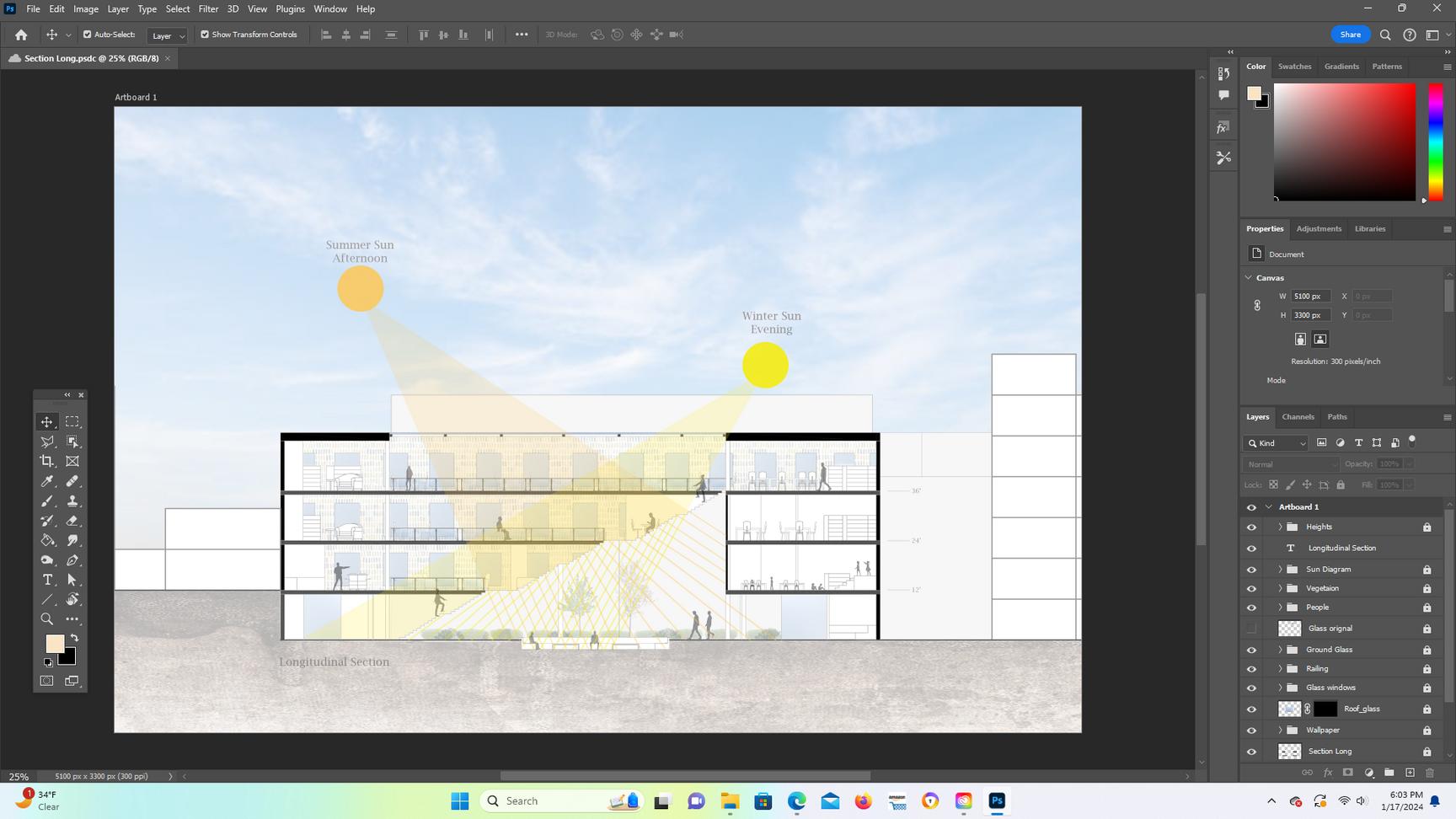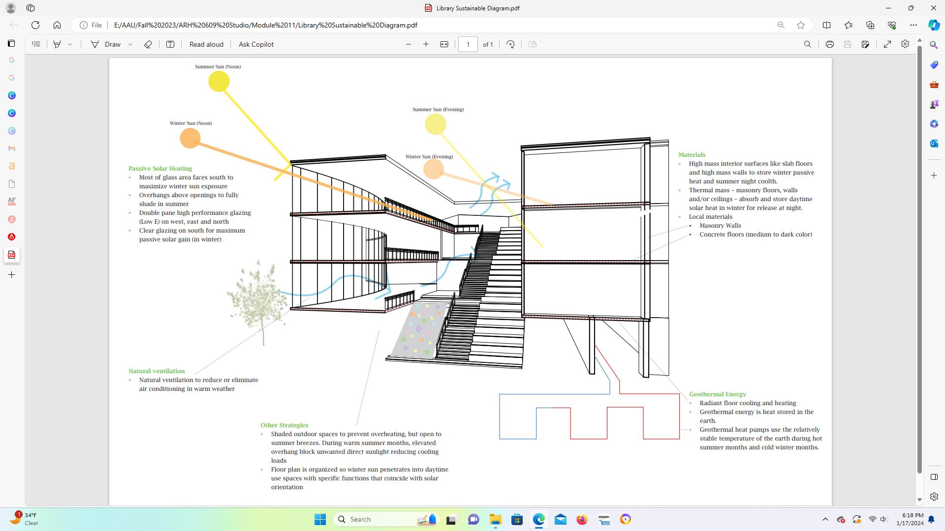 To reduce heating loads, passive solar strategies are implemented throughout the design. The floor plan is organized so winter sun penetrates into daytime use spaces with specific functions that coincide with solar orientation Solar glazing faces the south to maximize winter sun exposure. Designing the central circulation as a sunspace will heat itself and adjacent spaces in winter. Additionally, using specific materials such as high mass surfaces will absorb and store daytime solar heat in winter for release at night and will give cooler summer nights. Geothermal energy is implemented beneath ground to provide radiant floor cooling and heating