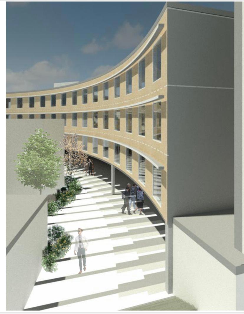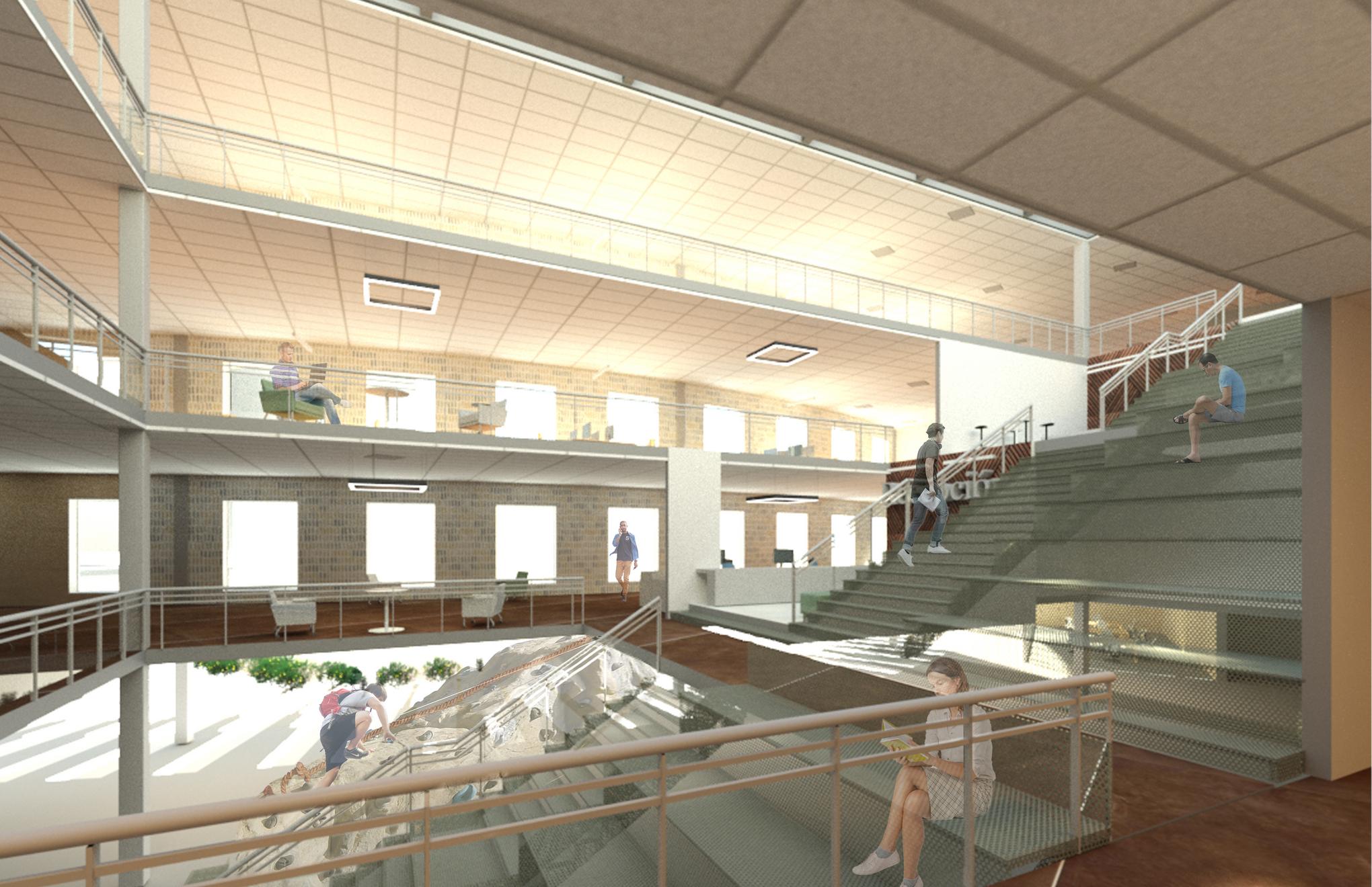 By elevating the structure, the ground level is left open for use as an extension of the city and pedestrian network The sunken reading pit and seat steps off er a place for people to gather and appreciate the greenery around them. Additionally, children can enjoy a range of obstacle courses, such as rock climbing and hanging monkey bars. The area can also be used as a public event space for concerts, conferences, and other events.