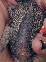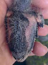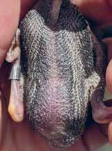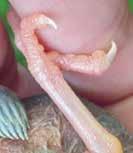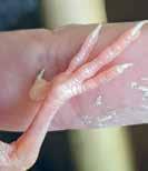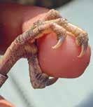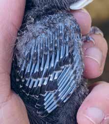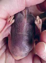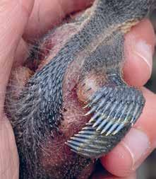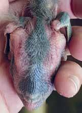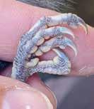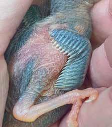 Foot and tarsus development is best identified through the colour shift from pink to grey and the improvement in grip strength (Figure 3), but there is a lot of variation. Claws are present from hatching, and toes are noticeably longer by day five or six. Pulli are generally large enough to take a ring by day six, but checking with pliers is recommended.